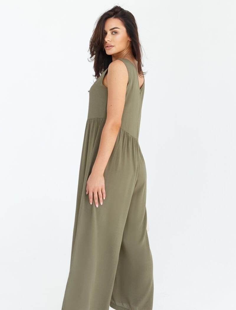 Khaki jumpsuit made of light cotton. Cropped wide-leg trousers create a flying silhouette. The top of the jumpsuit opens the shoulder line. The cut-off waist with asymmetry adds originality to the model.