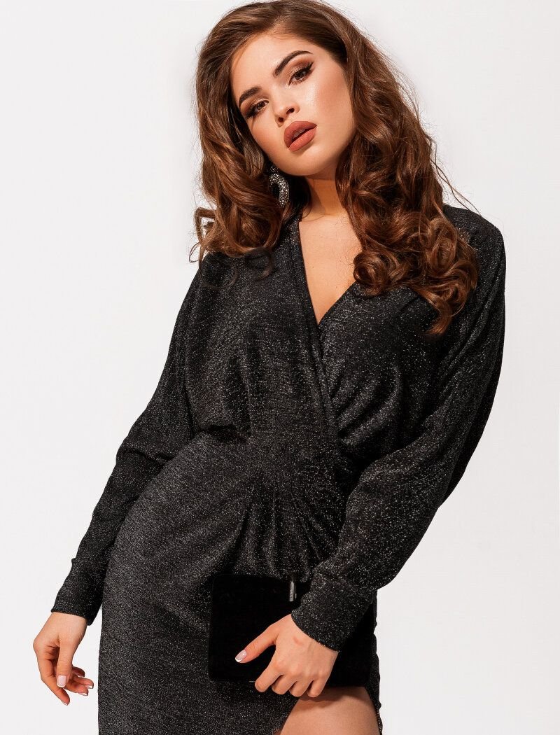 Shiny mini dress in black: v-neck, long voluminous sleeve, cut-off waist, the skirt is decorated with elegant drapery.