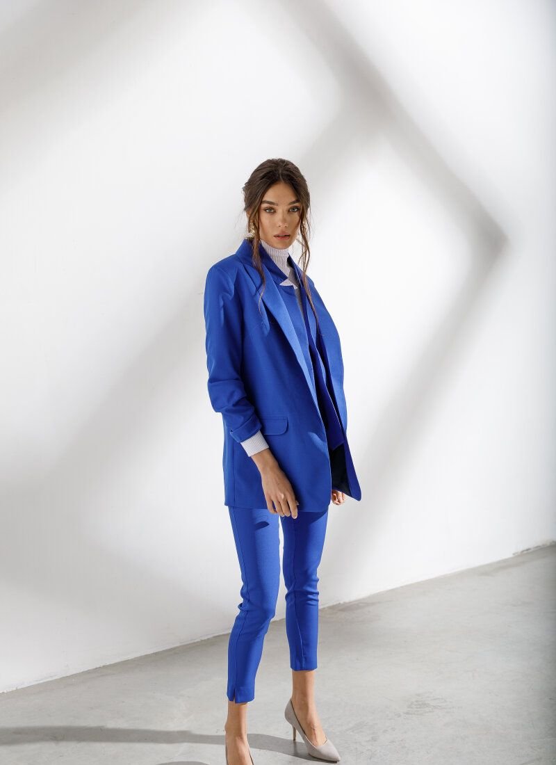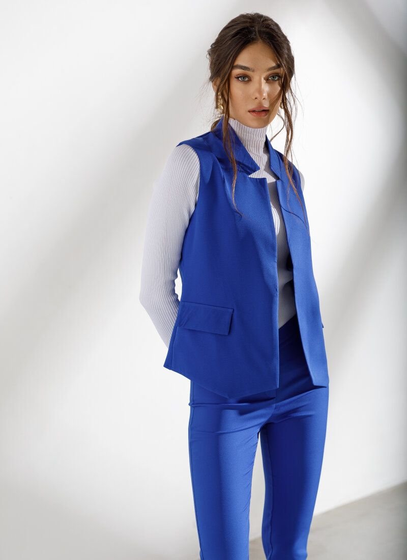Trendy pantsuit: a vest without a clasp with a stand-up collar and two flap pockets, straight-cut trousers with a medium button fit.