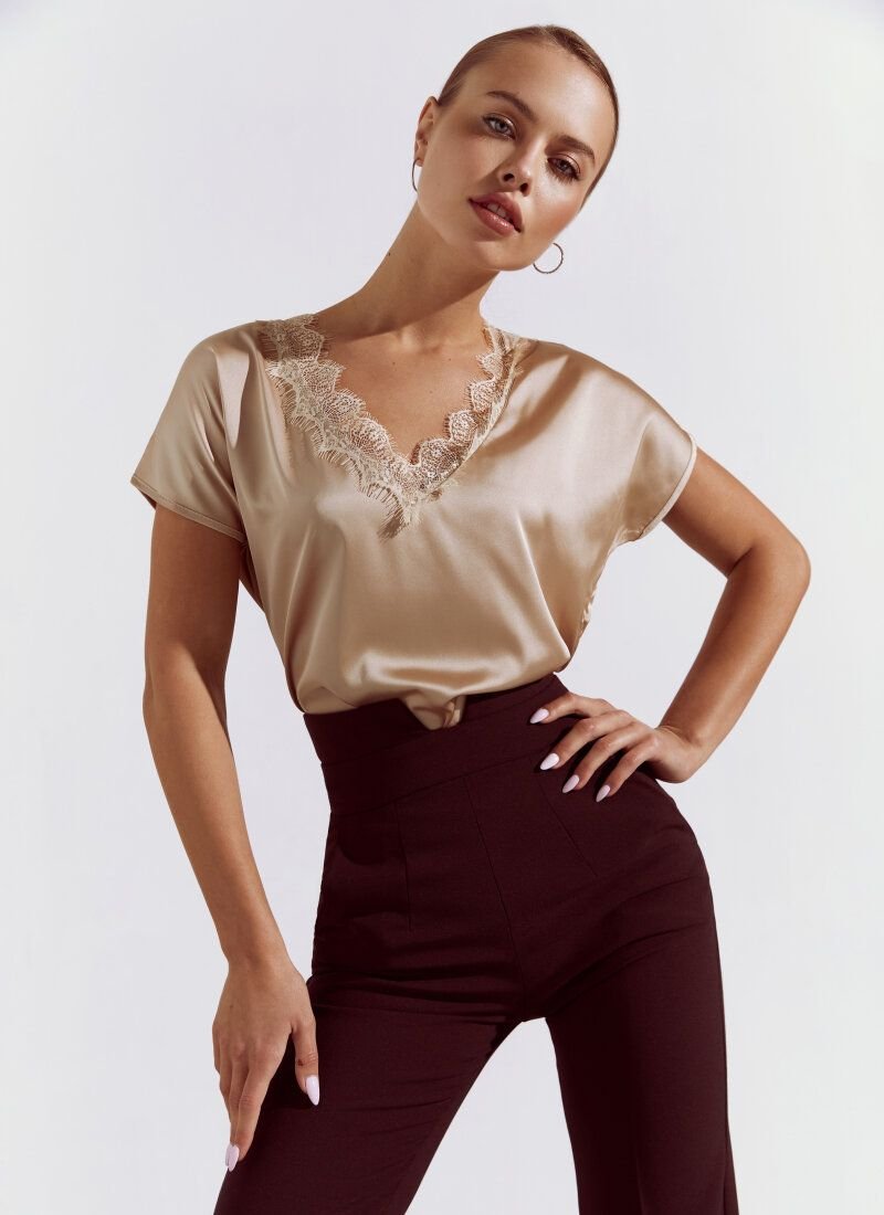 Silk blouse with a deep v-neck, decorated with sophisticated lace decor, and with a one-piece sleeve.
