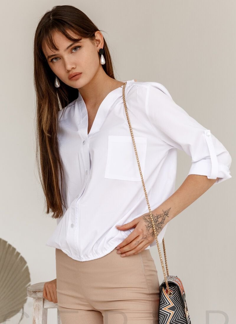 A light blouse with a loose fit with a small chest pocket, a strap with decorative buttons, a long sleeve with a length regulator (fastener-patches) and an elastic insert at the hem.