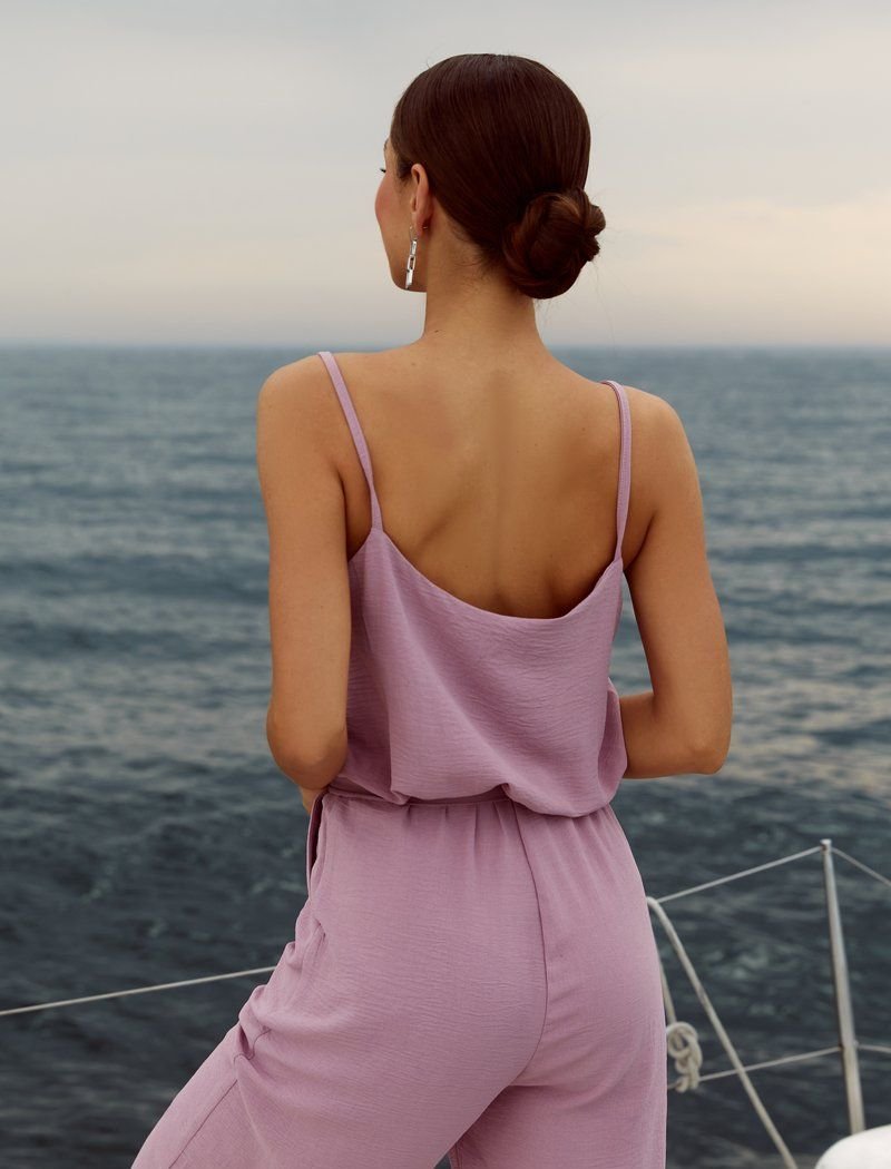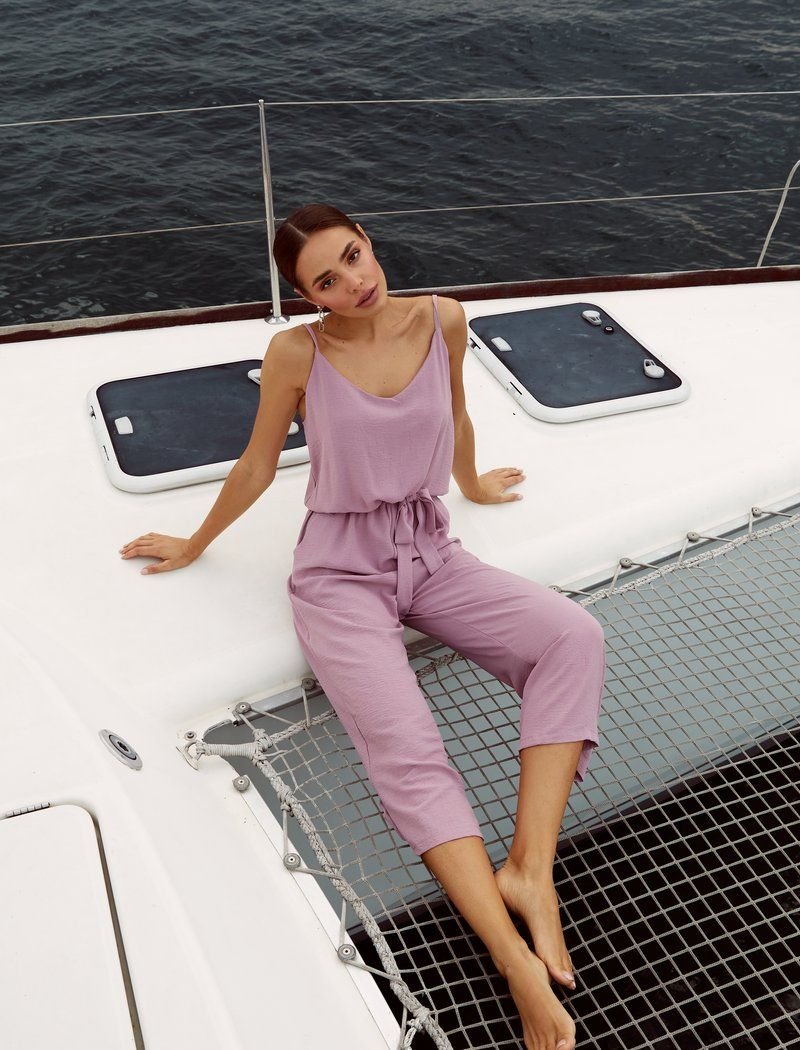 A loose-fitting pantsuit made of pressed fabric. Thin straps, a neat v-neck on the chest, an elastic insert on the waist and two small pockets on the sides. The set includes a removable belt-ribbon to match.