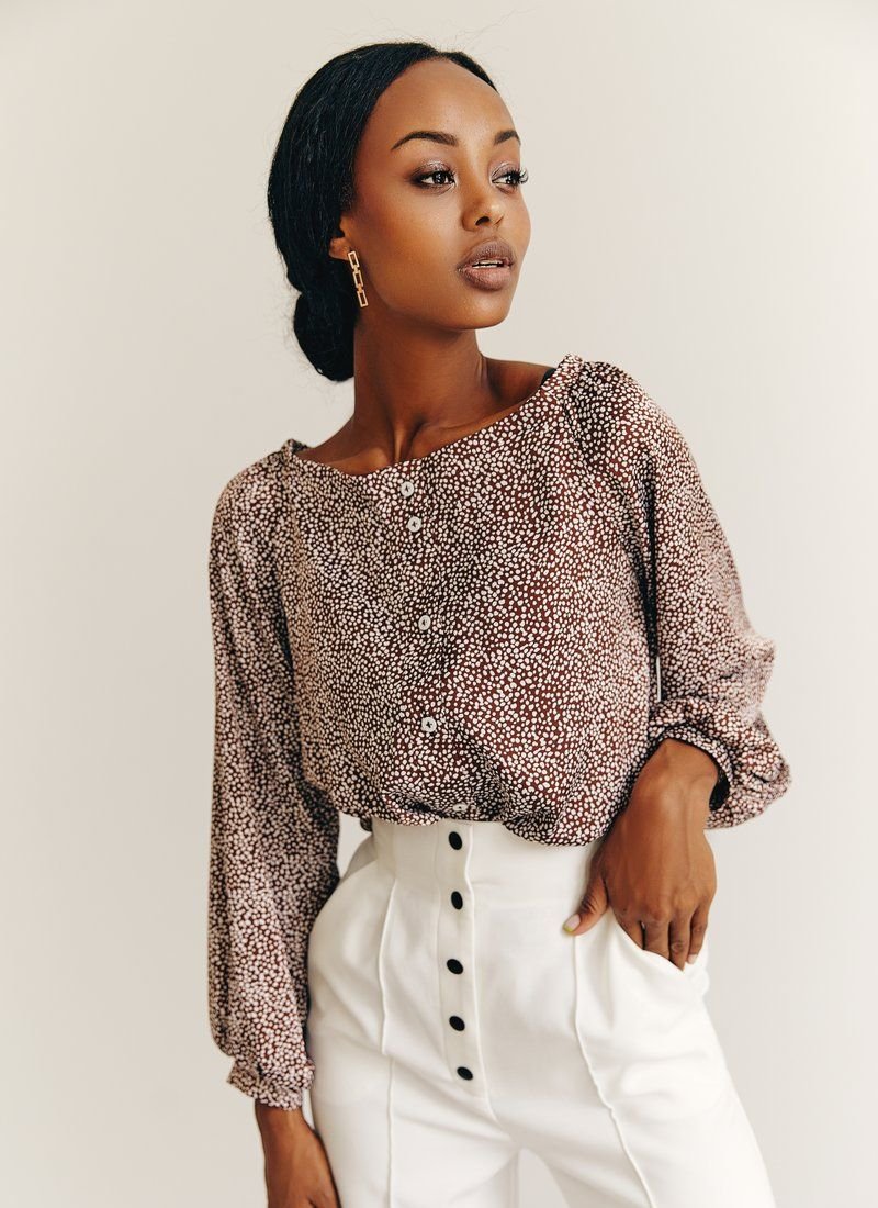 A chocolate-colored silk blouse with small white polka dots, with a boat neckline and an elastic insert on the back. Buttons on the front, long loose sleeve with thin cuffs.