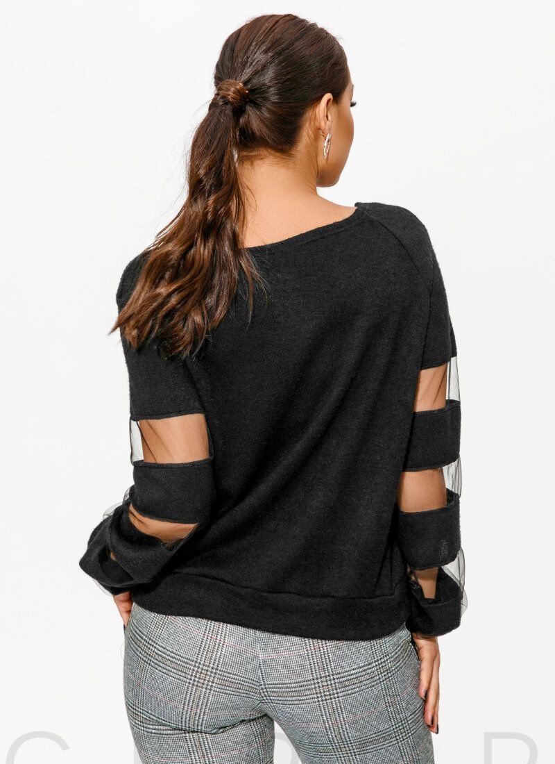 A loose-fitting knitted jumper with a round neck, long sleeves with mesh inserts and an elastic cuff. .