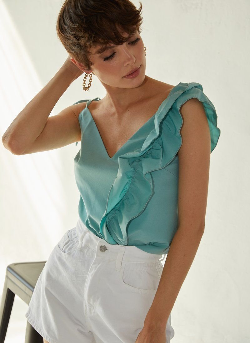 Stylish blouse of a loose cut with a v-neck, decorated from the shoulder diagonally with voluminous flounces. On the right shoulder there is a thin strap with a drawstring, and on the back there is a neat elastic insert. This blouse will perfectly complement any of your looks and will be a good choice for a warm summer.