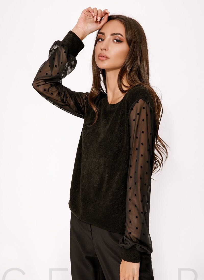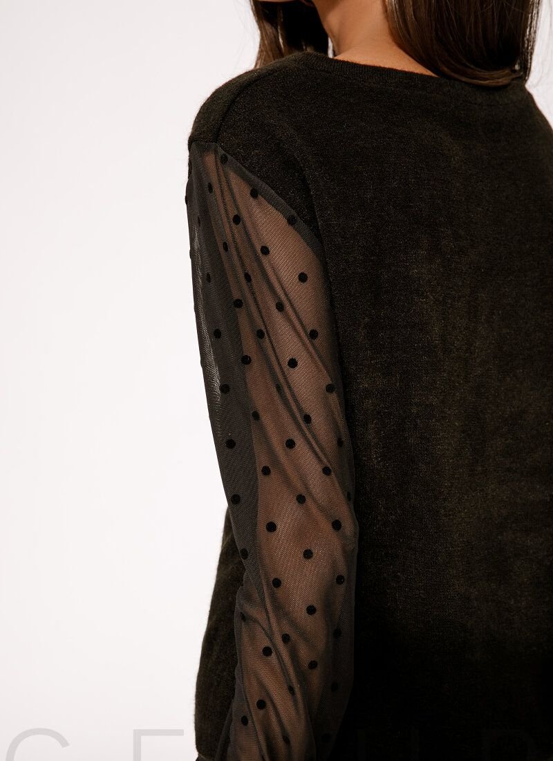 A warm jumper with a round neck, transparent sleeves with a flock coating and a knitted cuff.