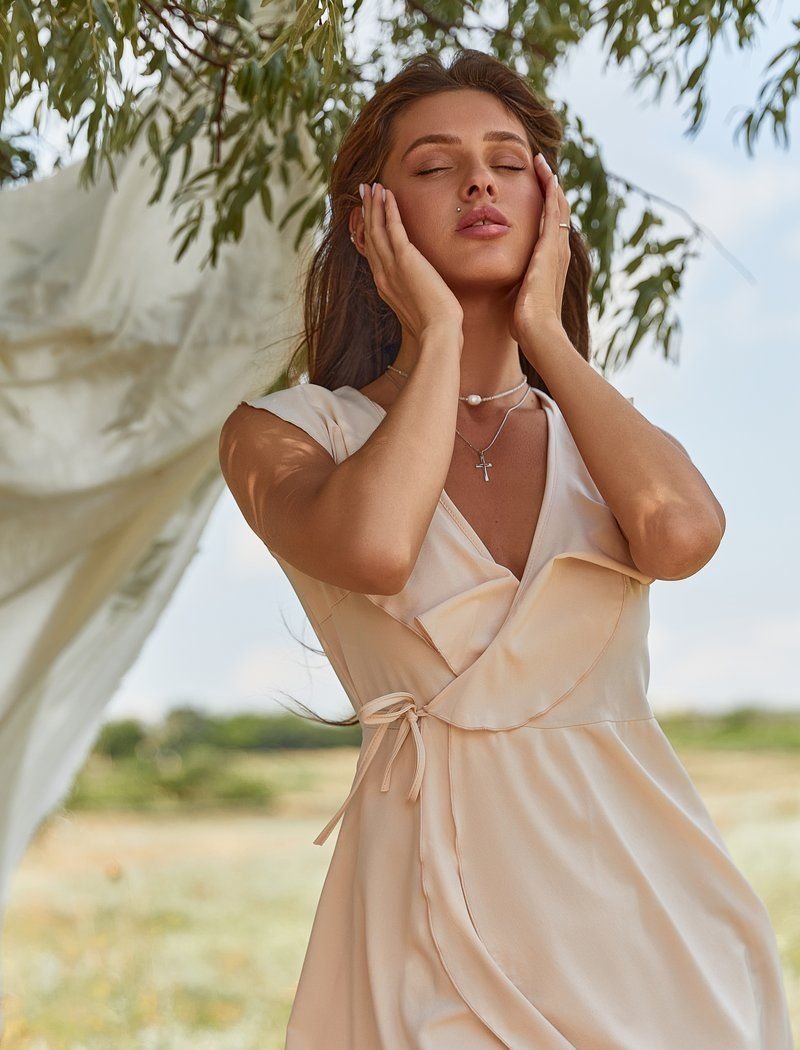 An airy dress for the smell, made of a light fabric of light beige color. A deep v-shaped neckline on the chest, a sewn multi-tiered skirt and a flounce decor.
