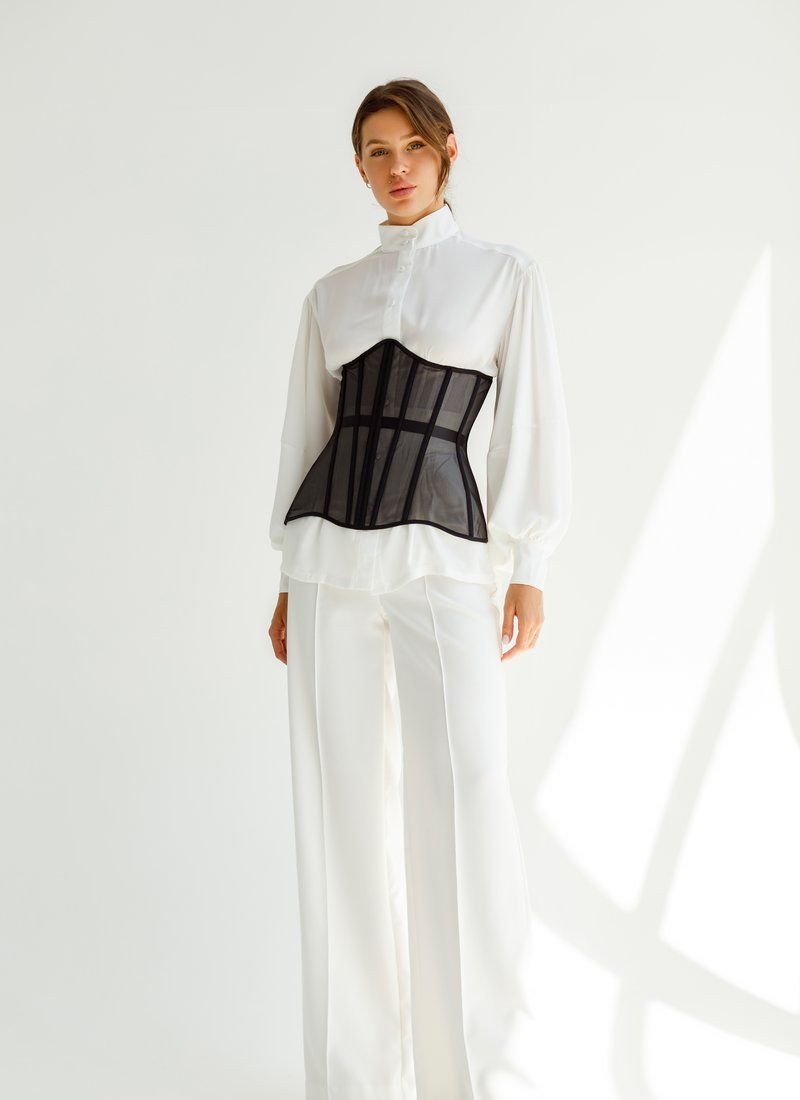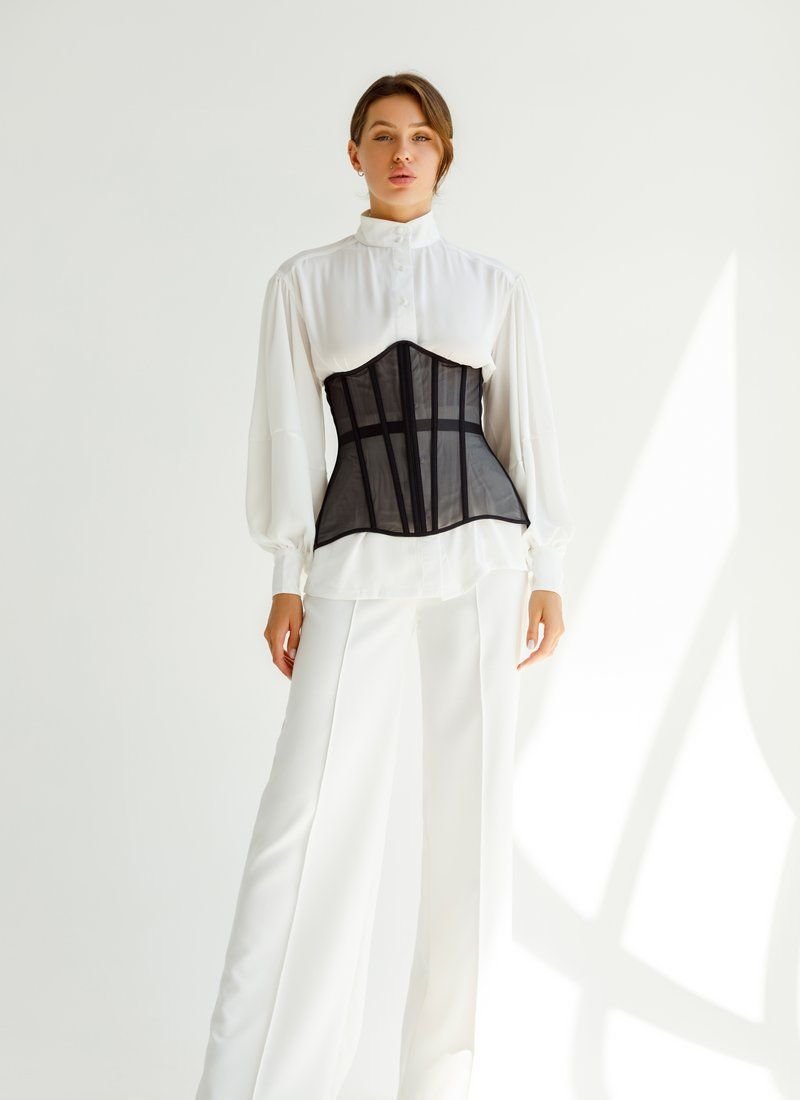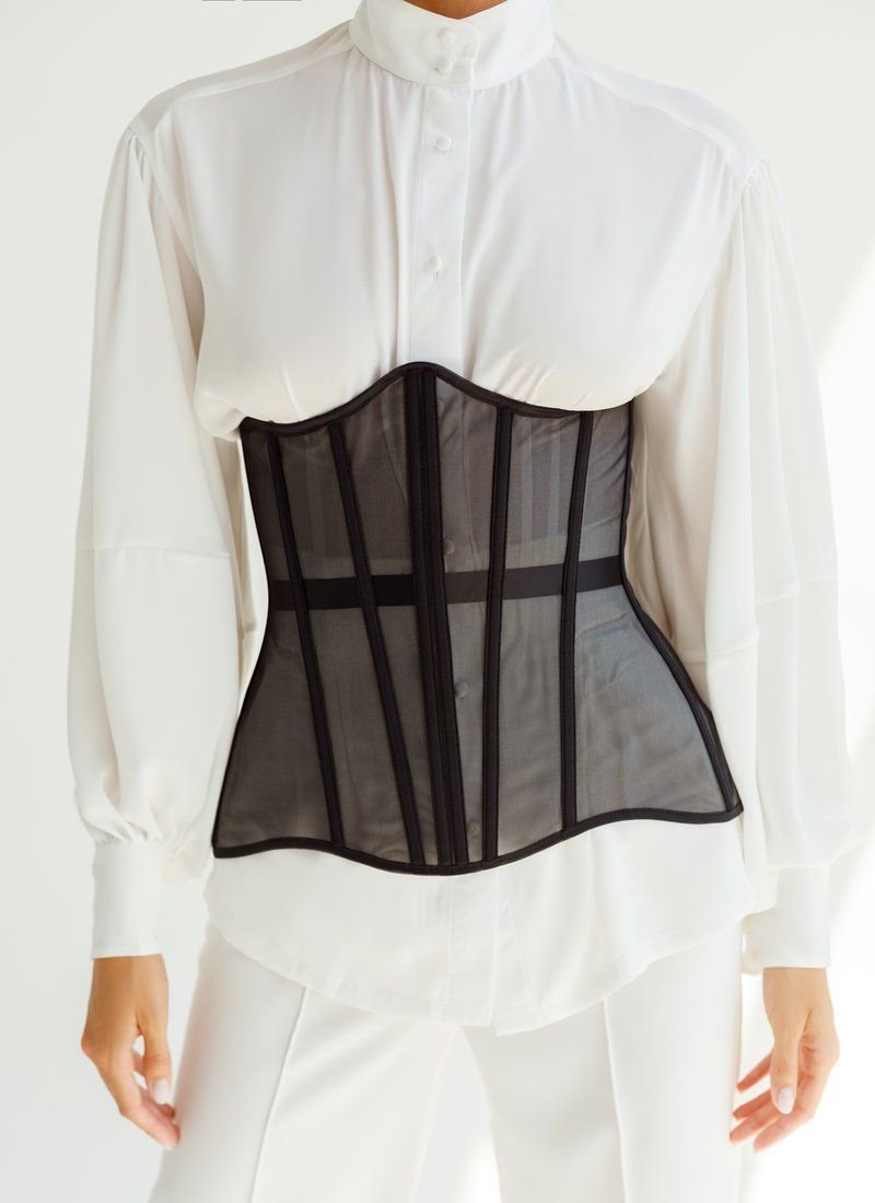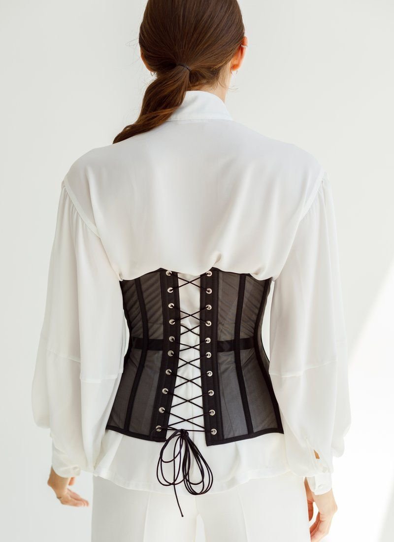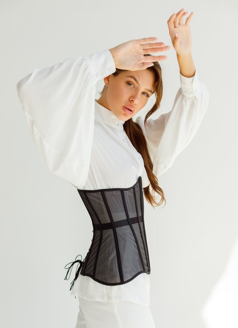 The actual corset made of mesh on the bones. It will become the highlight of your image, subtly emphasizing the waist. Can be worn over bulky T-shirts or shirts. You can also choose to wear a corset with lacing, or replace it with a thin ribbon that is included in the kit.