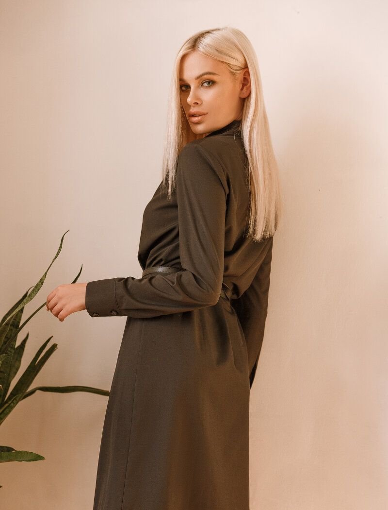 Straight-cut black shirt dress. V-neck with ruffles, turn-down collar. The model is complemented by a thin removable plain belt.