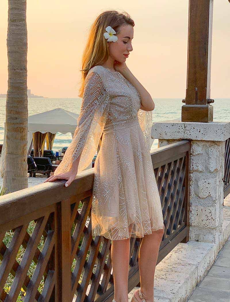 Gepur's bright glow* \nAn evening dress from Gepur designers made of an airy mesh decorated with a shimmering decor: a deep v-neck, an open back with silk ties, a flared sleeve with a slit along the entire length and a skirt complemented by a light petticoat made of double tulle. The face of the collection: Popular Instagram blogger and it-girl-Kristina Krait. \n*The product is decorated with an original dusting, which creates the effect of a shimmering Gepur train: excess dusting crumbles a little, leaving a light star trail.