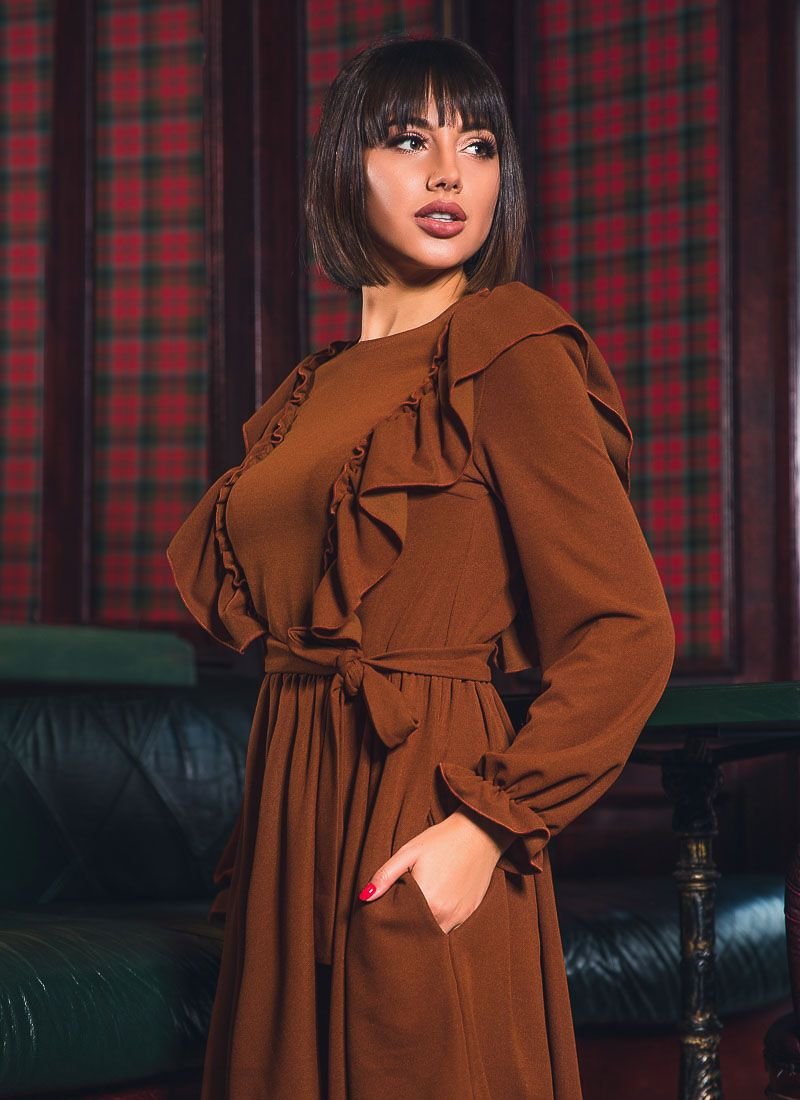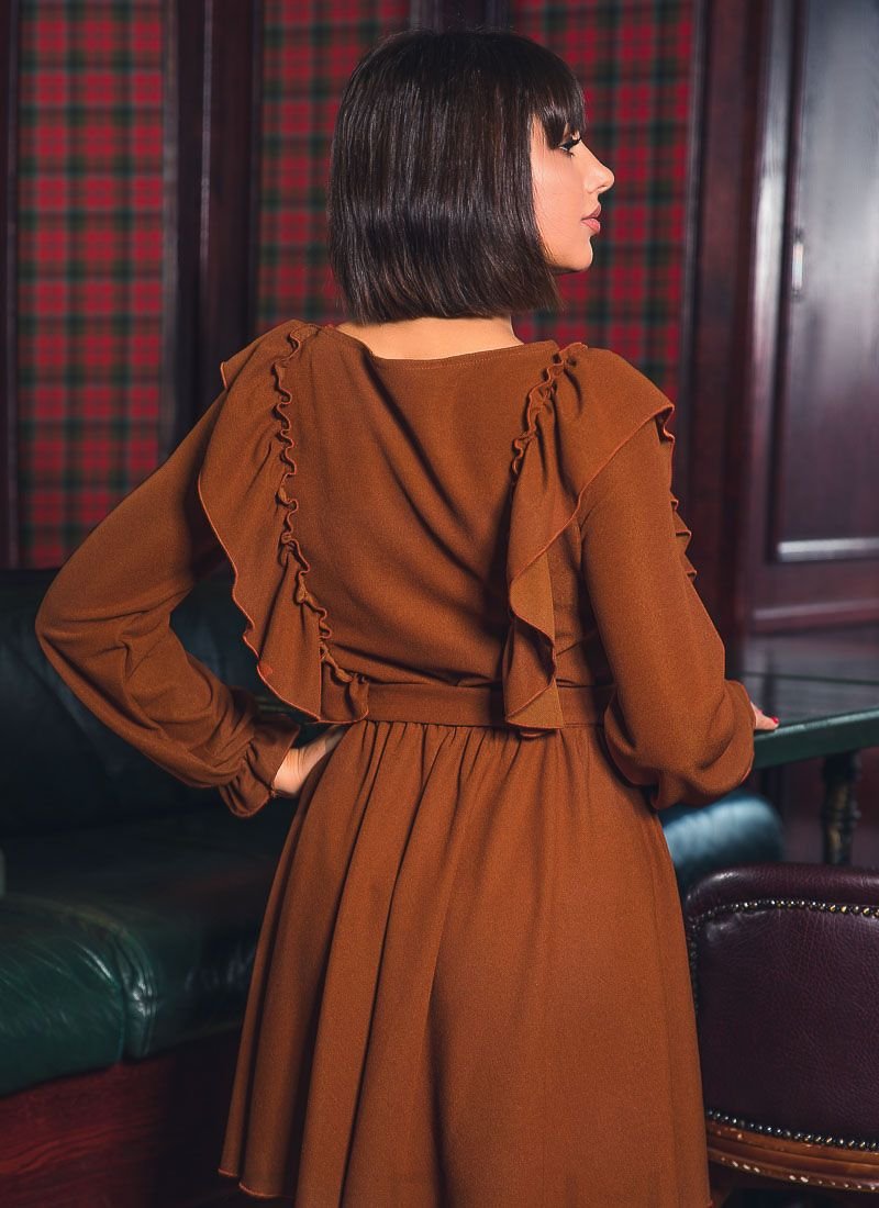 Elegant mini dress with ruffles in the front, round neck, removable matching belt, bishop sleeve on elastic cuff and pleated skirt.