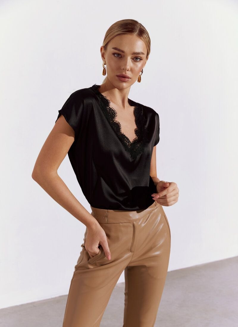 Silk blouse with a deep v-neck, decorated with sophisticated lace decor, and with a one-piece sleeve.