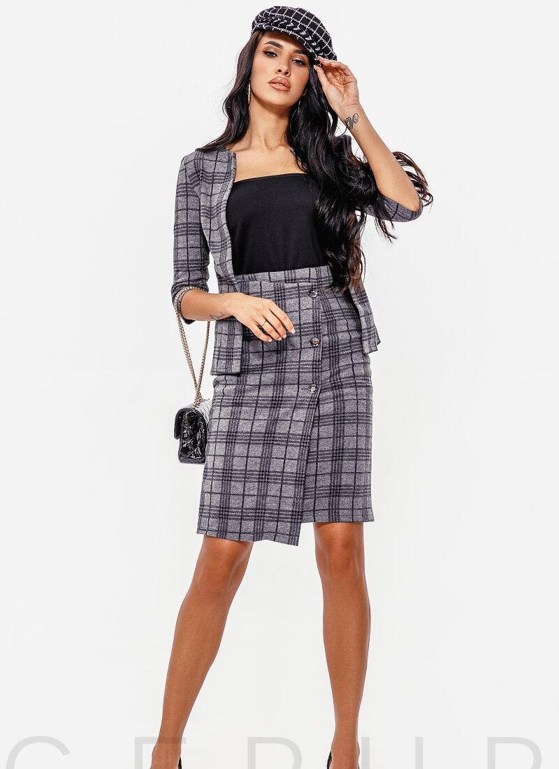 Knitted two-piece suit in gray: a classic fitted jacket without a collar and buttons with 3/4-length sleeves, an asymmetric midi skirt of medium fit for a fixed smell. ...