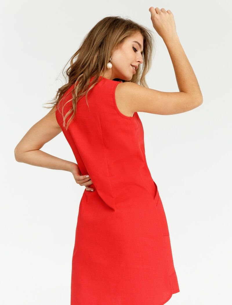 The dress has a laconic straight cut with a round collar. Two patch pockets on the hips, an elongated back.