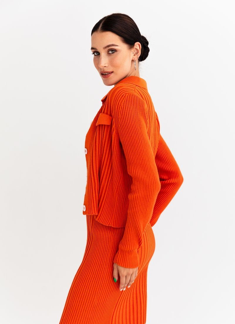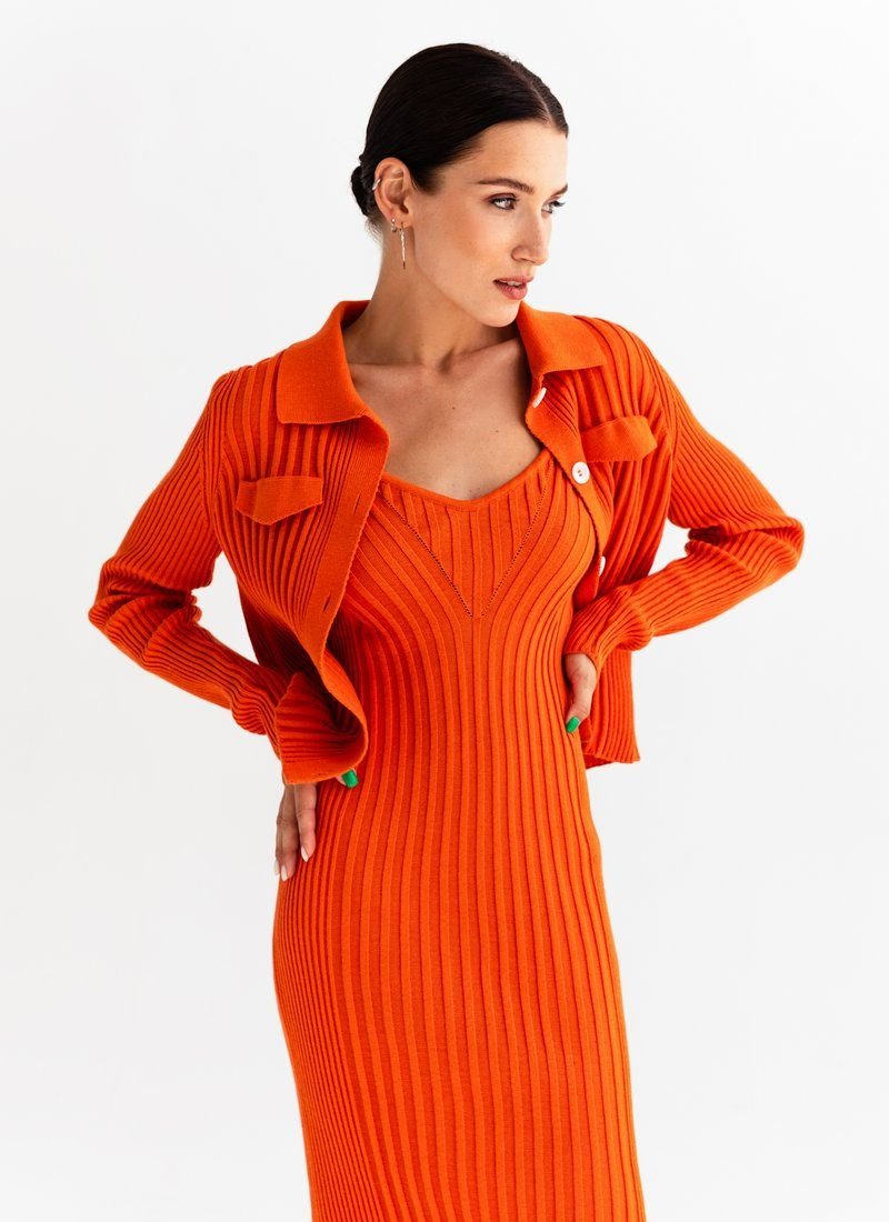 An up-to-date set of bright ribbed knitted fabric. It includes a form-fitting dress with thin straps and a cardigan with a turn-down collar, chest pockets and textured buttons.