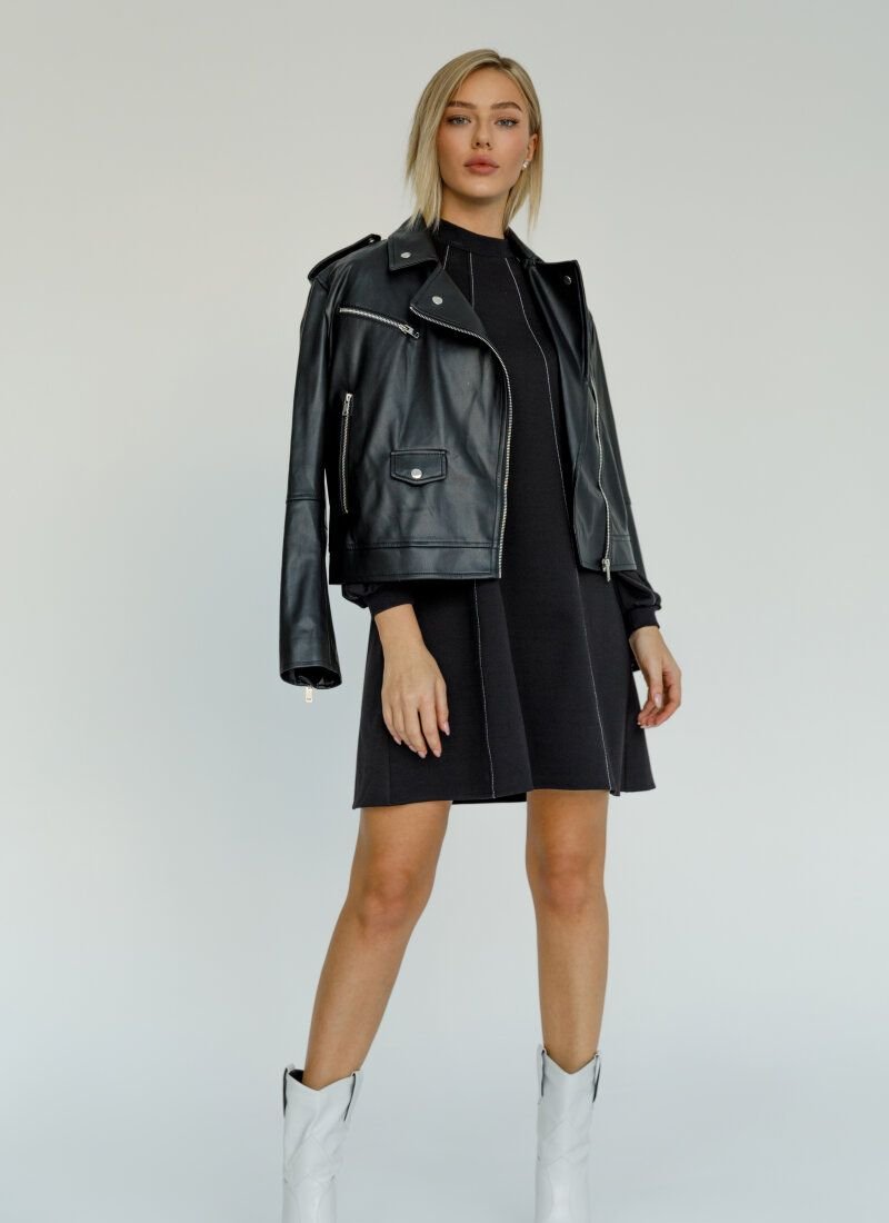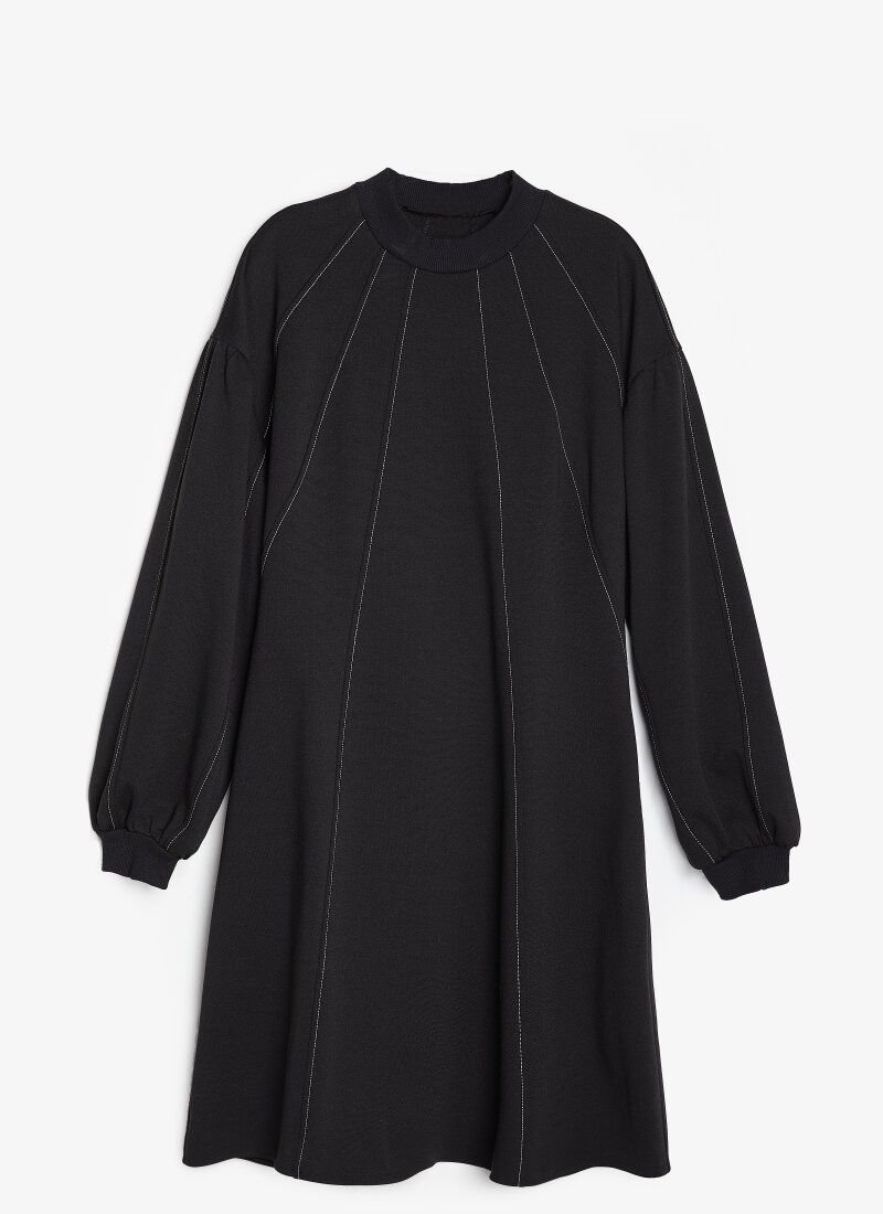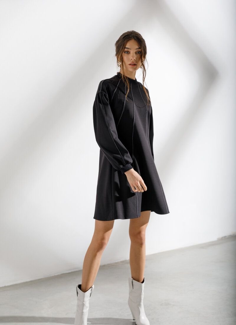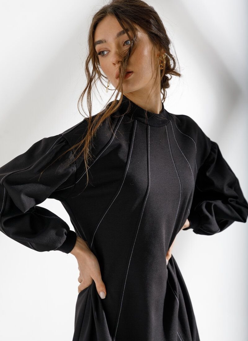 A loose black dress from the new collection of 2021 has become more expressive due to decorative contrasting stitches descending from the collar. Gepur designers have supplemented the model with an actual element of the Fendi and Balenciaga shows in the FW’20/21 season - voluminous sleeves.