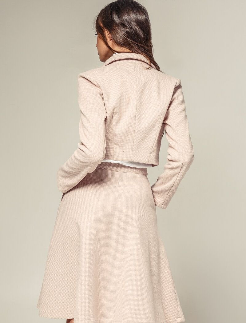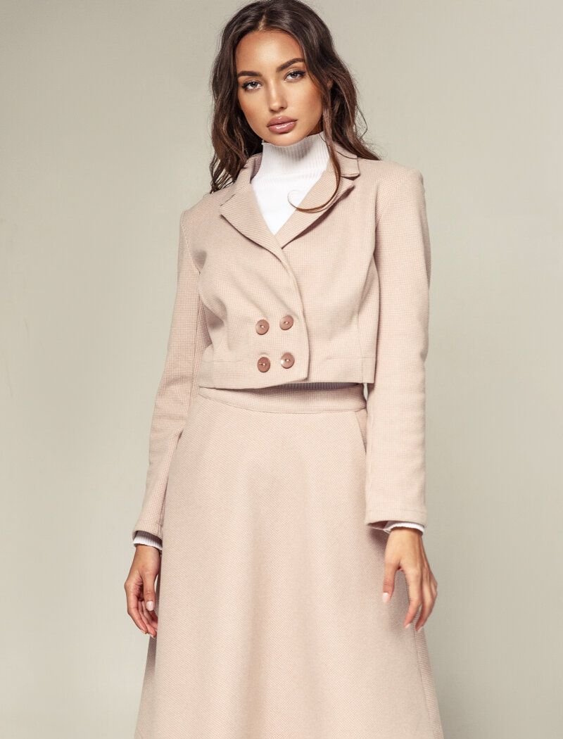 The powdery midi skirt is cleaned of all possible details, focusing on the soft material with the trendy "crow's foot" print. The model was supplemented with side pockets.