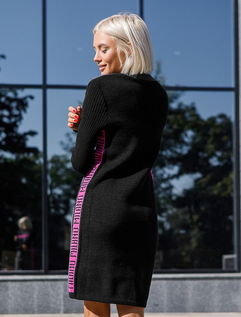 A warm sweater dress with colored inserts, a contrasting back, a long sleeve without cuffs and two welt pockets in the front.