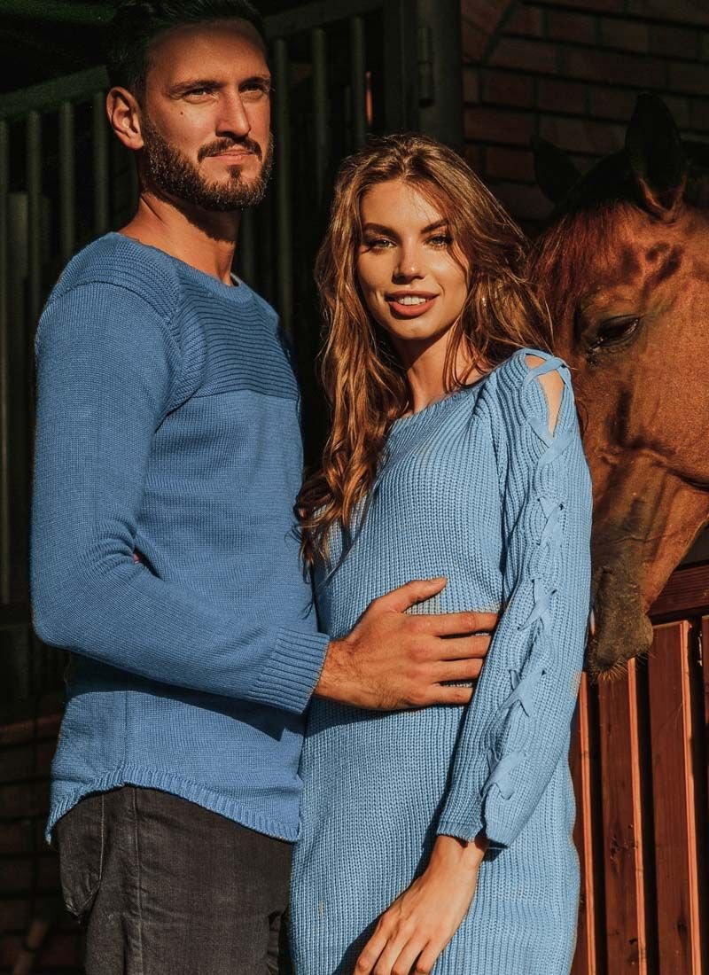 Knitted jumper in blue, elongated cut with decorative lacing on the sleeve.