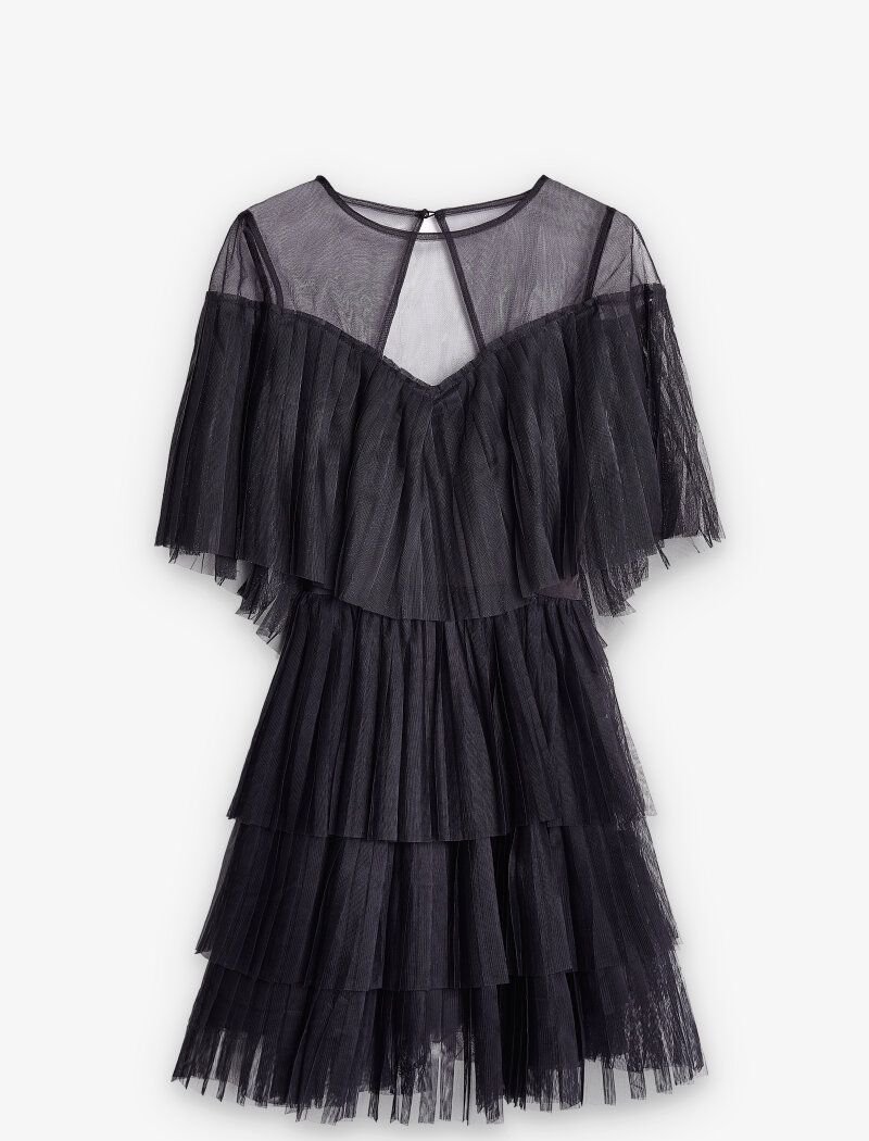 A short black dress is made of silk material and pieces of light pleated fabric that form flounces along the entire length. Due to this, the model turns out to be voluminous. The shoulder line is opened by a translucent yoke, and the product was supplemented with a curly neckline on the back. A mini-dress will become a self-sufficient basis for an evening image, the only companions he needs ? black sandals with high heels and a clutch.\nThe collection was presented by the finalist of Miss Ukraine 2015, a popular Instagram blogger and it-girl-Krystal Victoria.