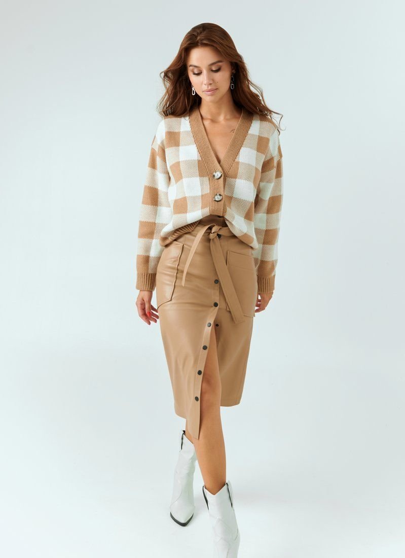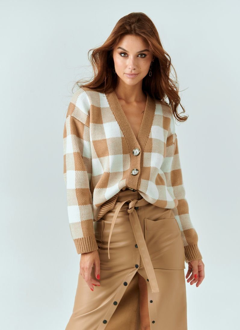 Beige wool jumper in a large white check. In this model there are round sperdi buttons, which are stylized as a tree.