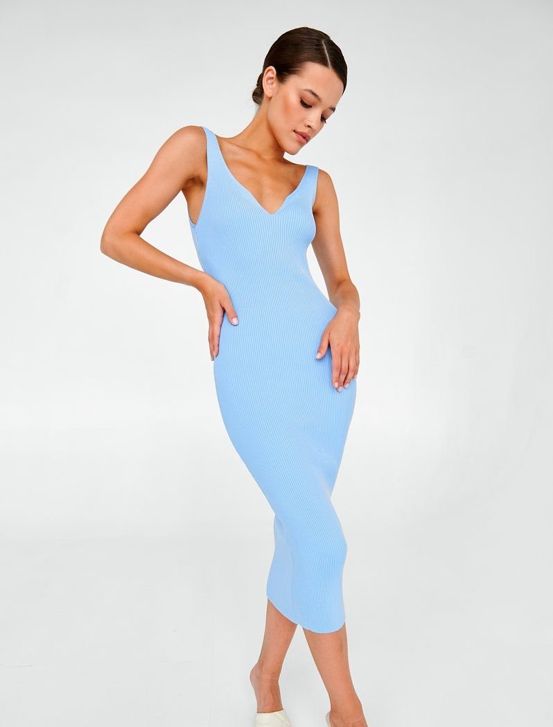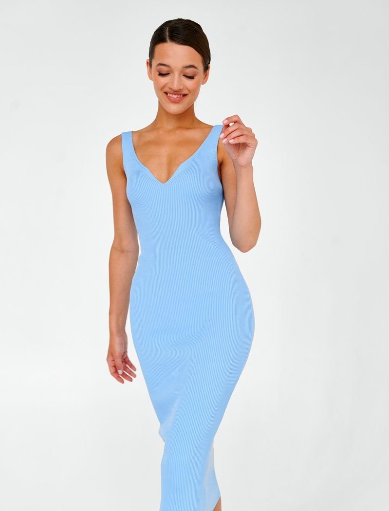 A delicate blue midi dress with a v-neck on wide straps. It will beautifully emphasize your figure and will be an excellent choice for both a casual image and an evening out.