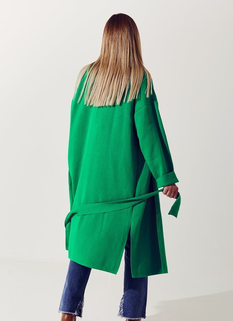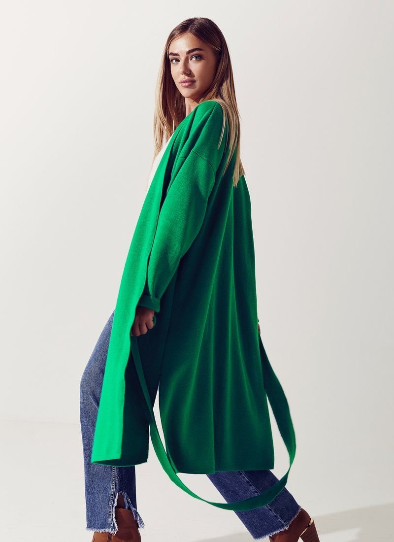 A bright oversize green cardigan of knee length will add an accent to your look. The set includes a matching belt, and the model is stylized with slits on the sides.
