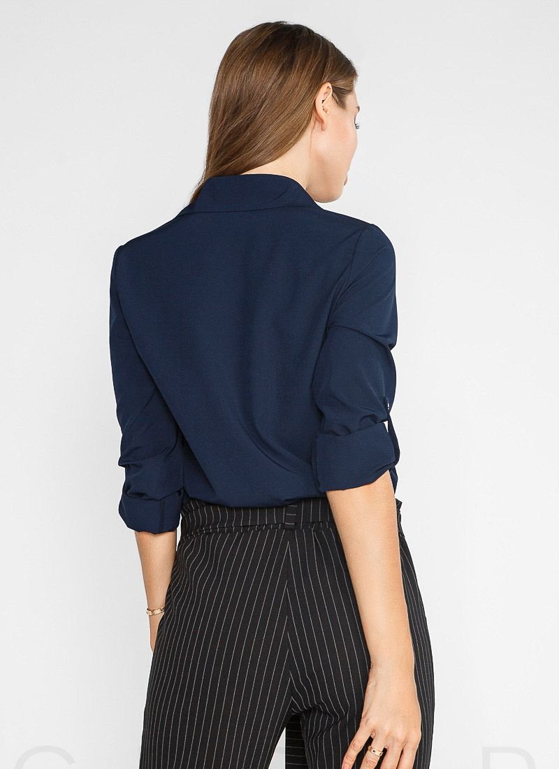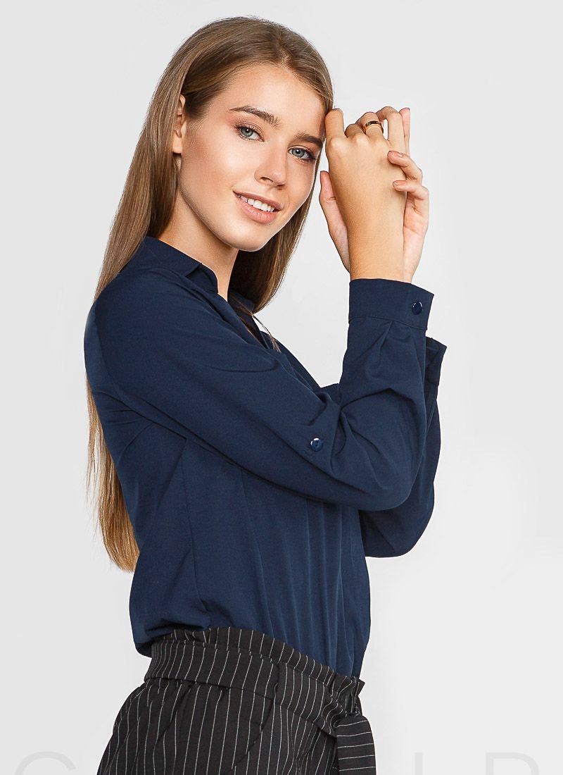 Plain blouse with button closure: classic turn-down collar, long sleeve with cuff, small chest pocket and elastic hem with odor fixation.