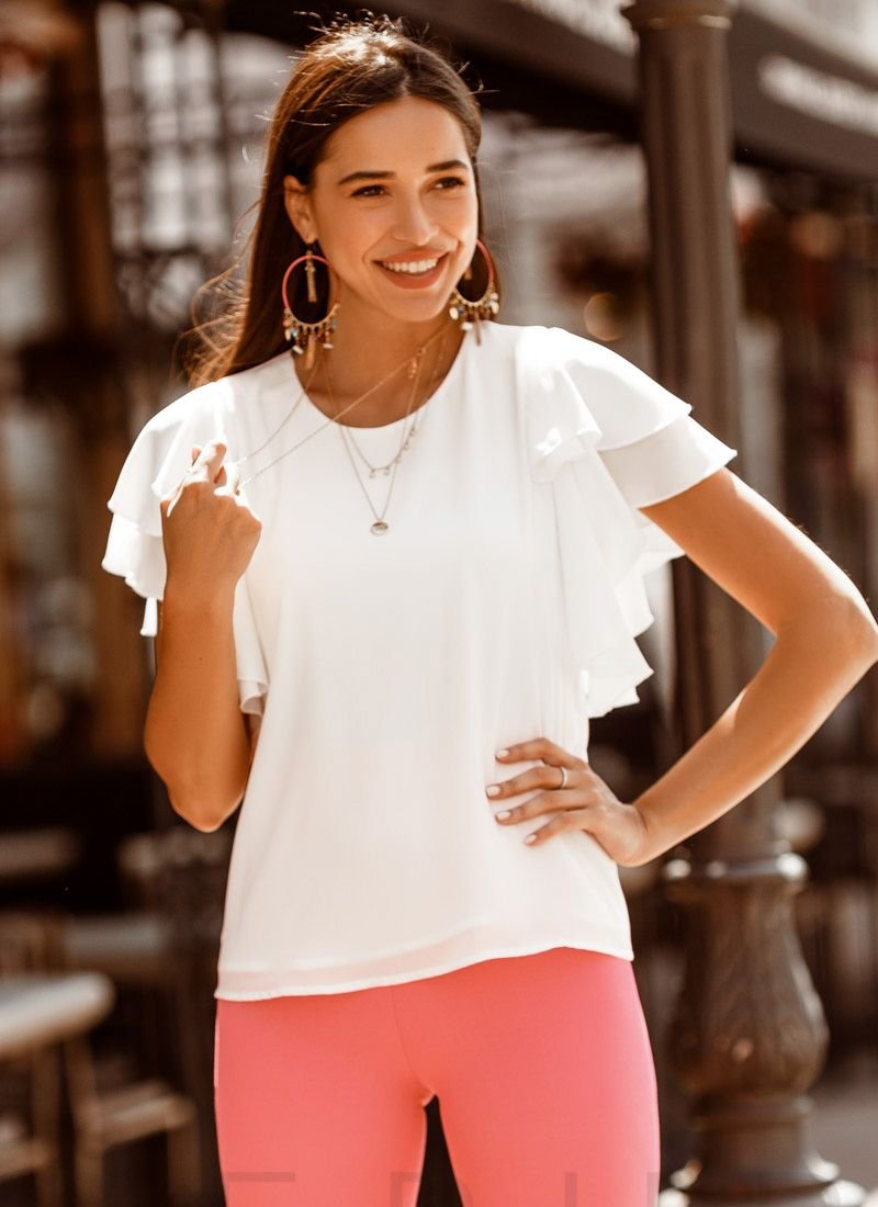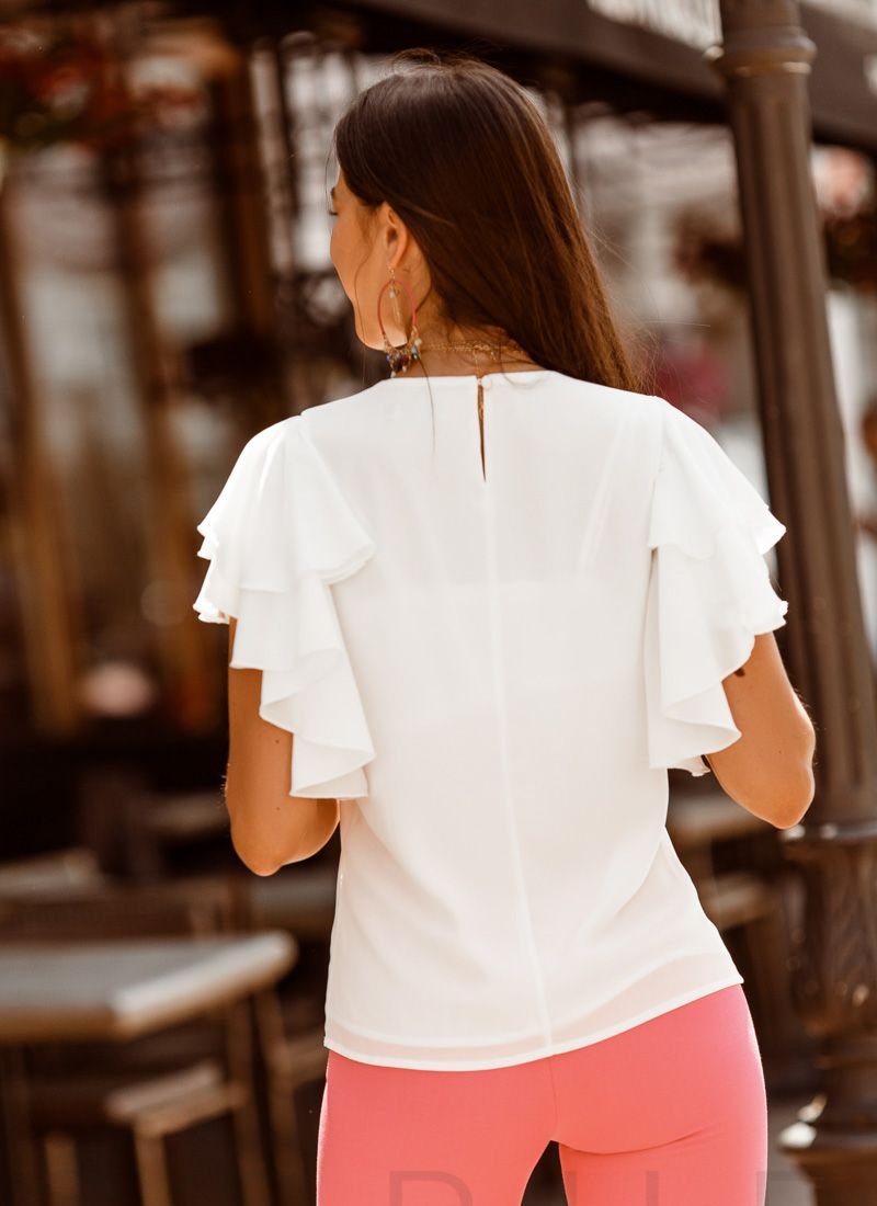An up-to-date loose-cut chiffon blouse with a classic round neck and a sleeve with a layered flounce, created by Gepur designers.