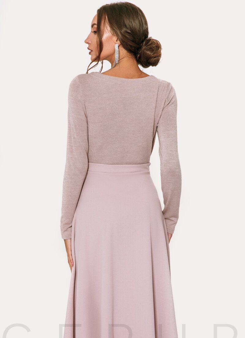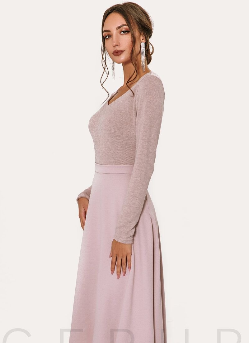 Midi dress in a delicate shade: knitted top, v-neck, long sleeve, waistband and flared skirt.