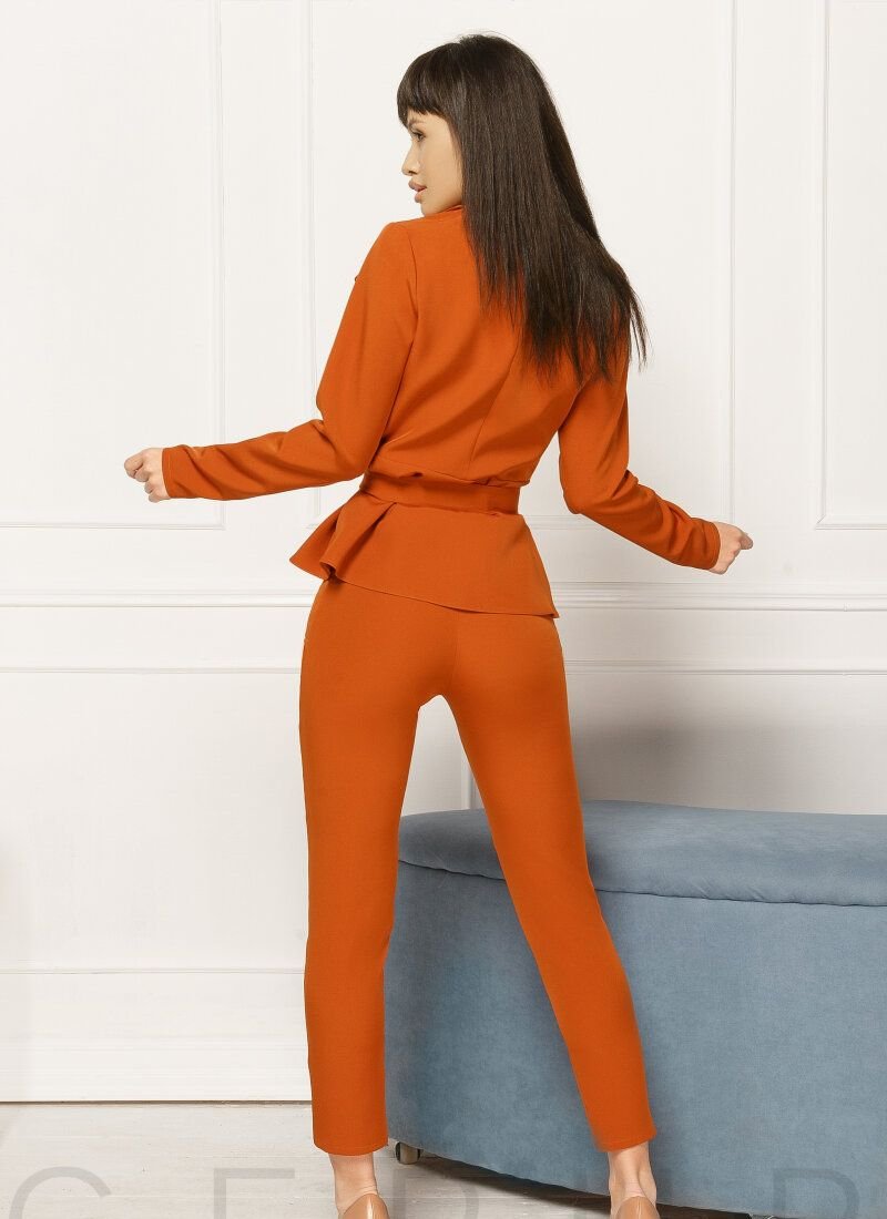 Business suit of terracotta shade. Fitted blazer for the smell with lapels, long sleeves, pockets-deceptions and a removable belt. Trousers with a narrow cut and a high fit.