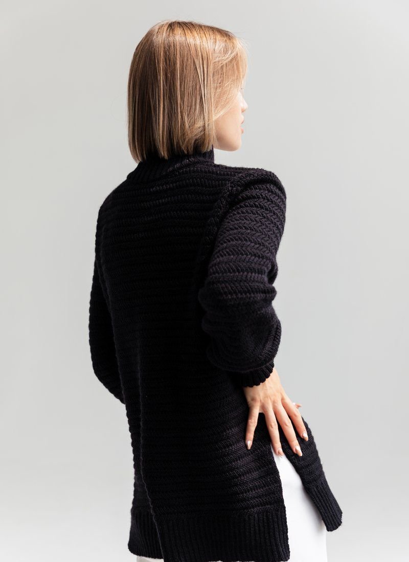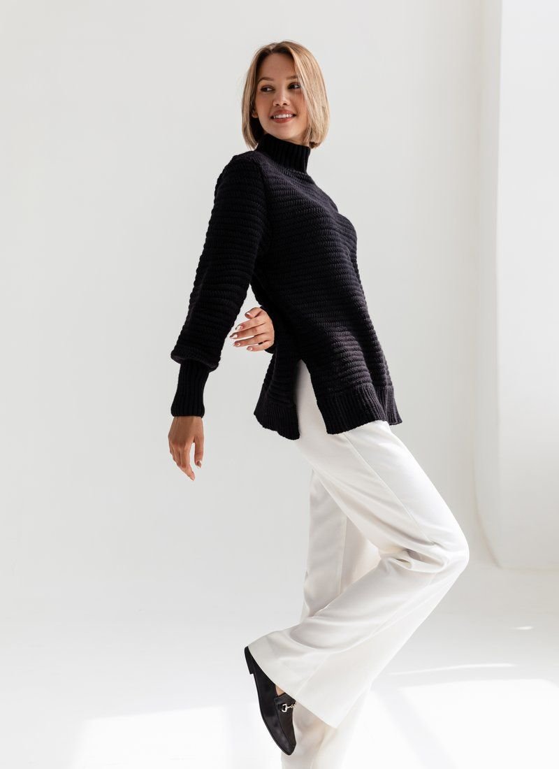 Elongated black sweater with small slits on the sides, stand-up collar. This model is made with long wide sleeves with cuffs.
