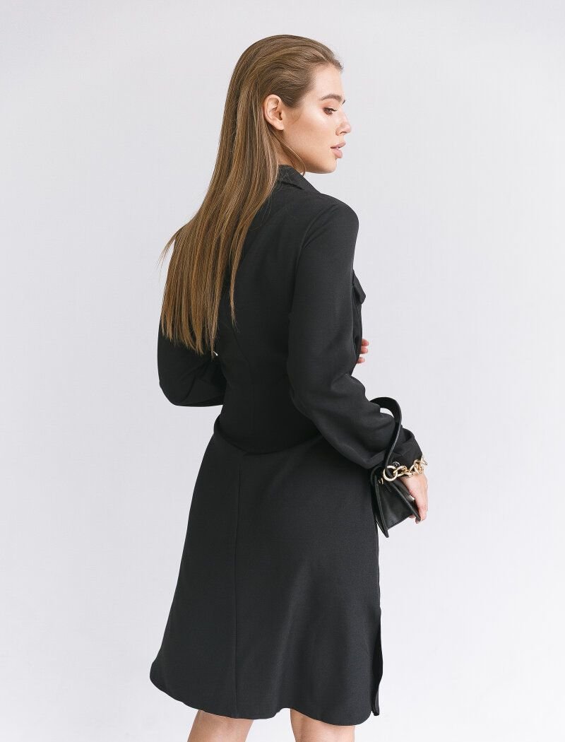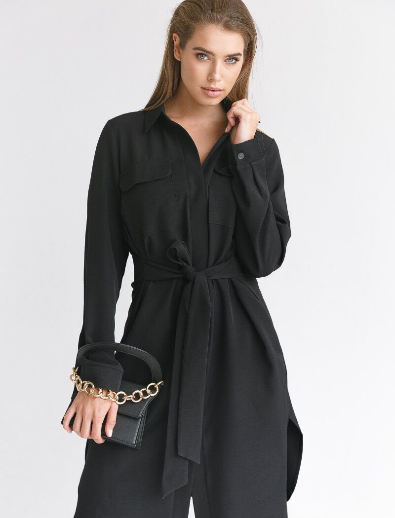 A basic black shirt dress with a turn-down collar, a long sleeve with a patch closure, chest pockets, two pockets in the seams and a sewn belt to match.