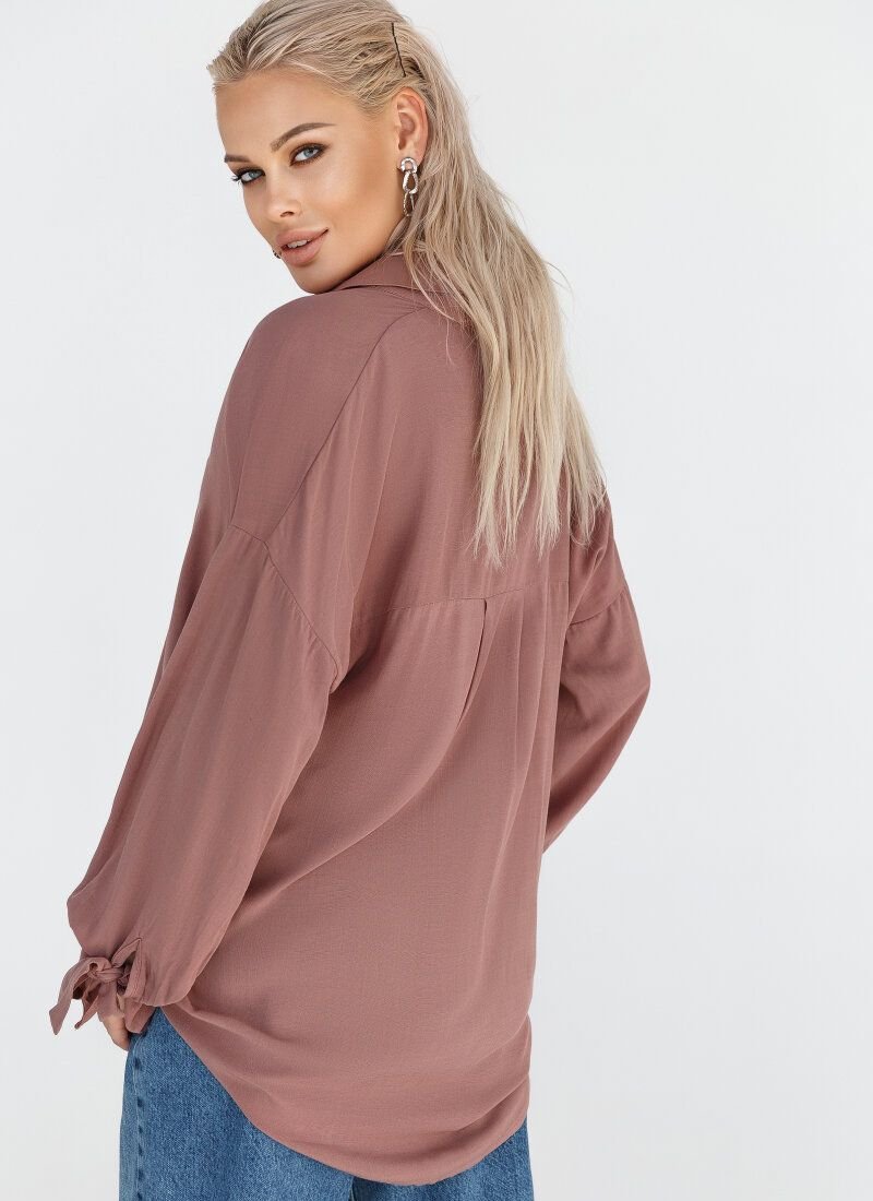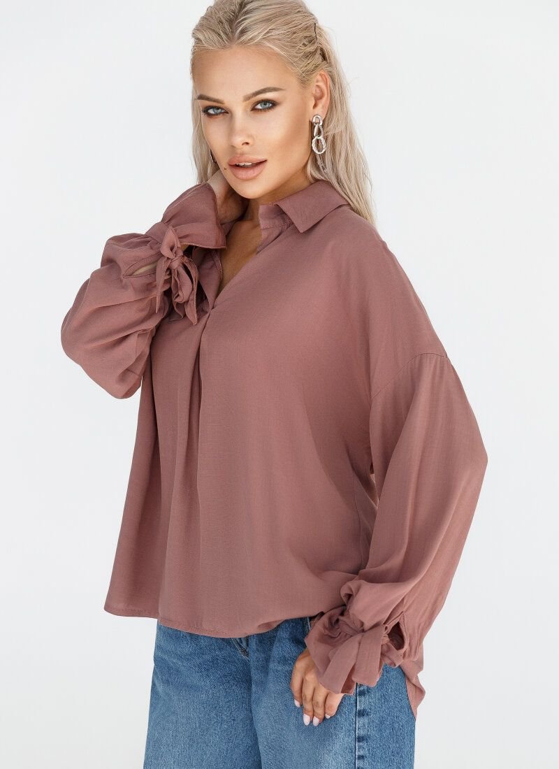 A loose-fitting shirt in a basic beige color combined with wide slouchy jeans creates a comfortable look for every day. Laconicity of the style is diluted by loose sleeves on the cuffs, decorated with openwork ruffles. The model is complemented by an asymmetric hem.