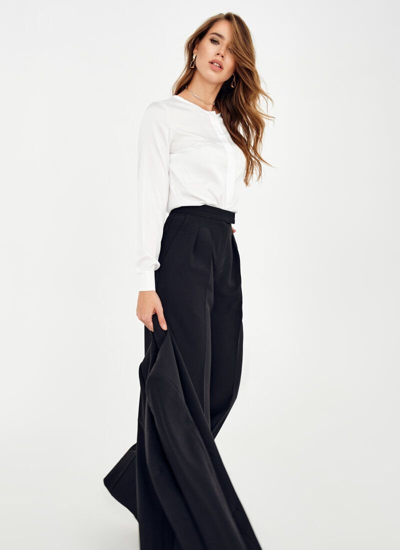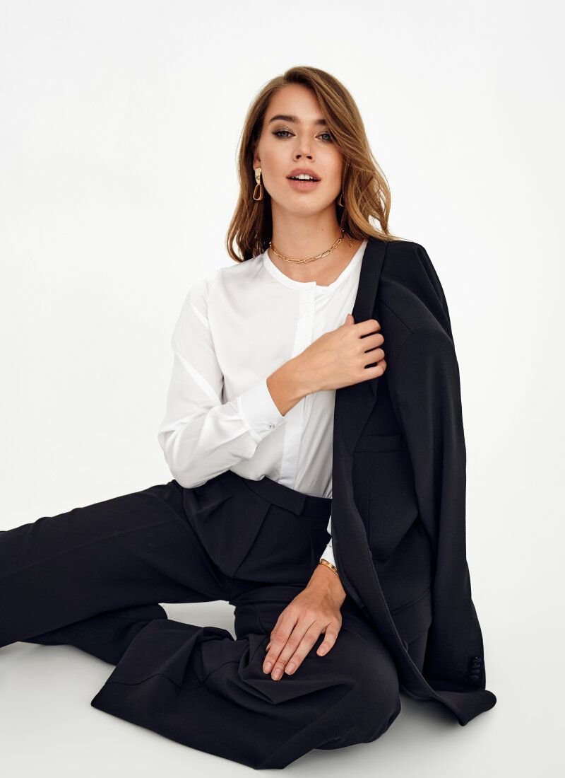 A strict silk blouse, white with a round neck, long sleeves and a hidden placket with buttons in front.