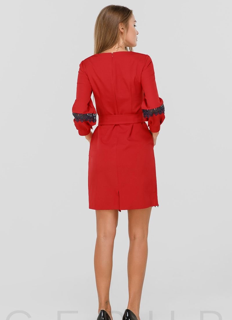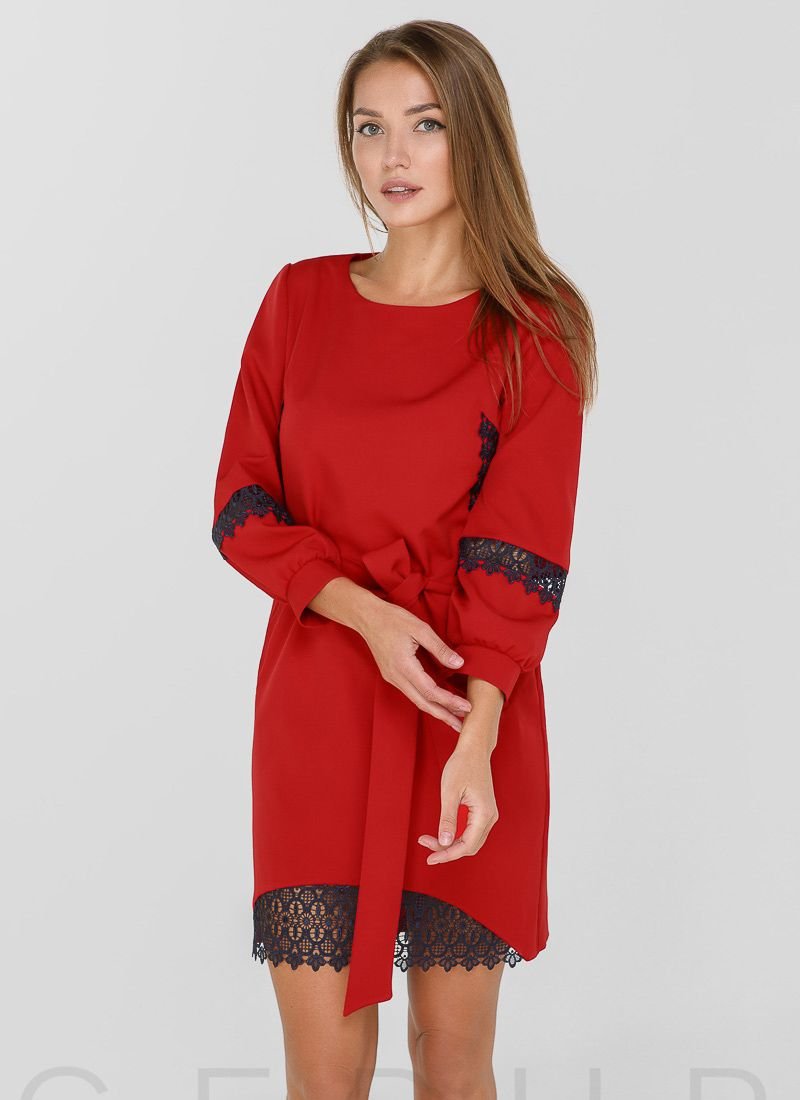 An elegant straight-cut dress made of dense costume fabric with lace trim: a neat round neckline, a long flashlight sleeve with a button cuff, two welt pockets, a small slit slit and a removable belt to match.