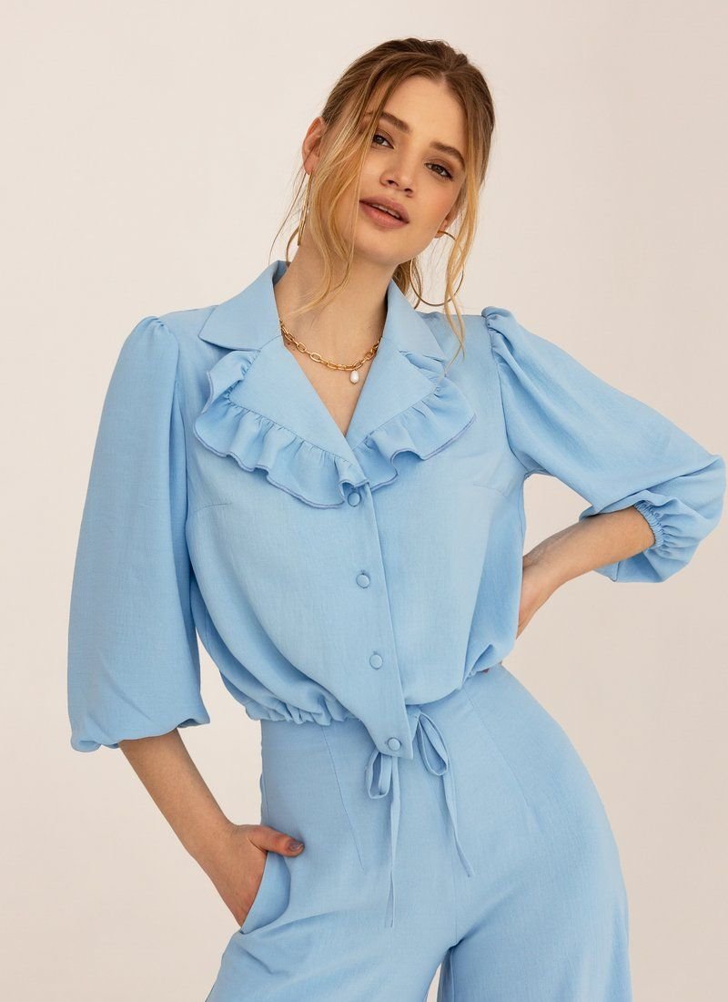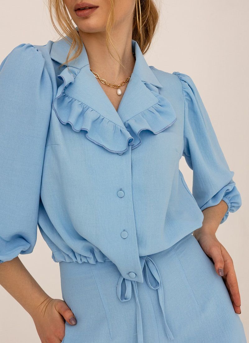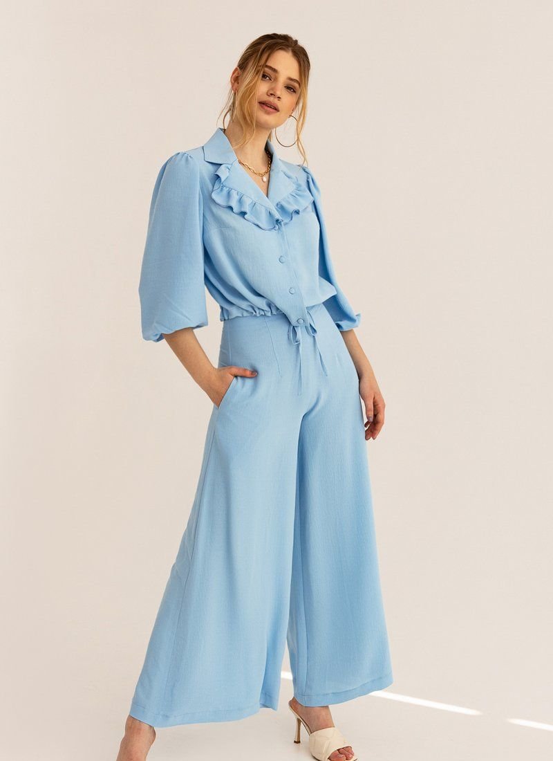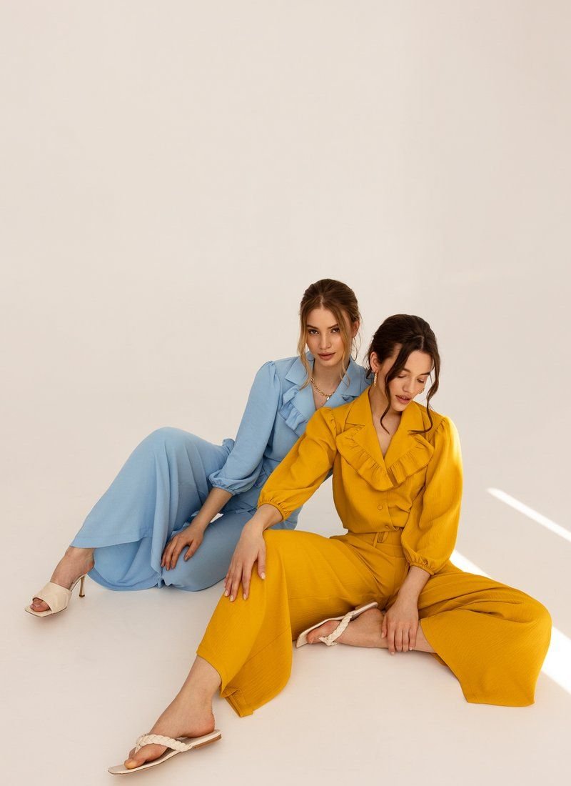 The suit with a jacket and flared trousers is made of a lightweight material that allows the skin to breathe in hot weather. The loose cut of the model supports the most up-to-date silhouette in SS'21. The jacket was complemented with a turn-down collar with ruffles and a drawstring at the bottom edge.