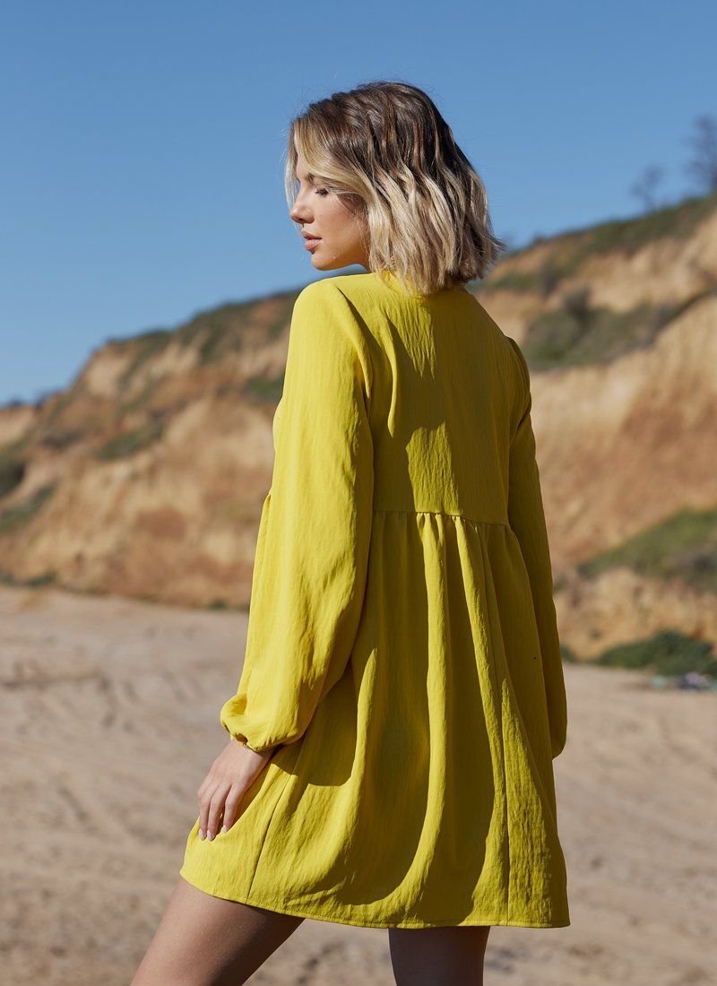 A dress made of light cotton material will look organically with ballet flats and sneakers. For versatility, things work both a monochrome mustard color and a laconic cut with an inflated waistline, v-neck and long sleeves.