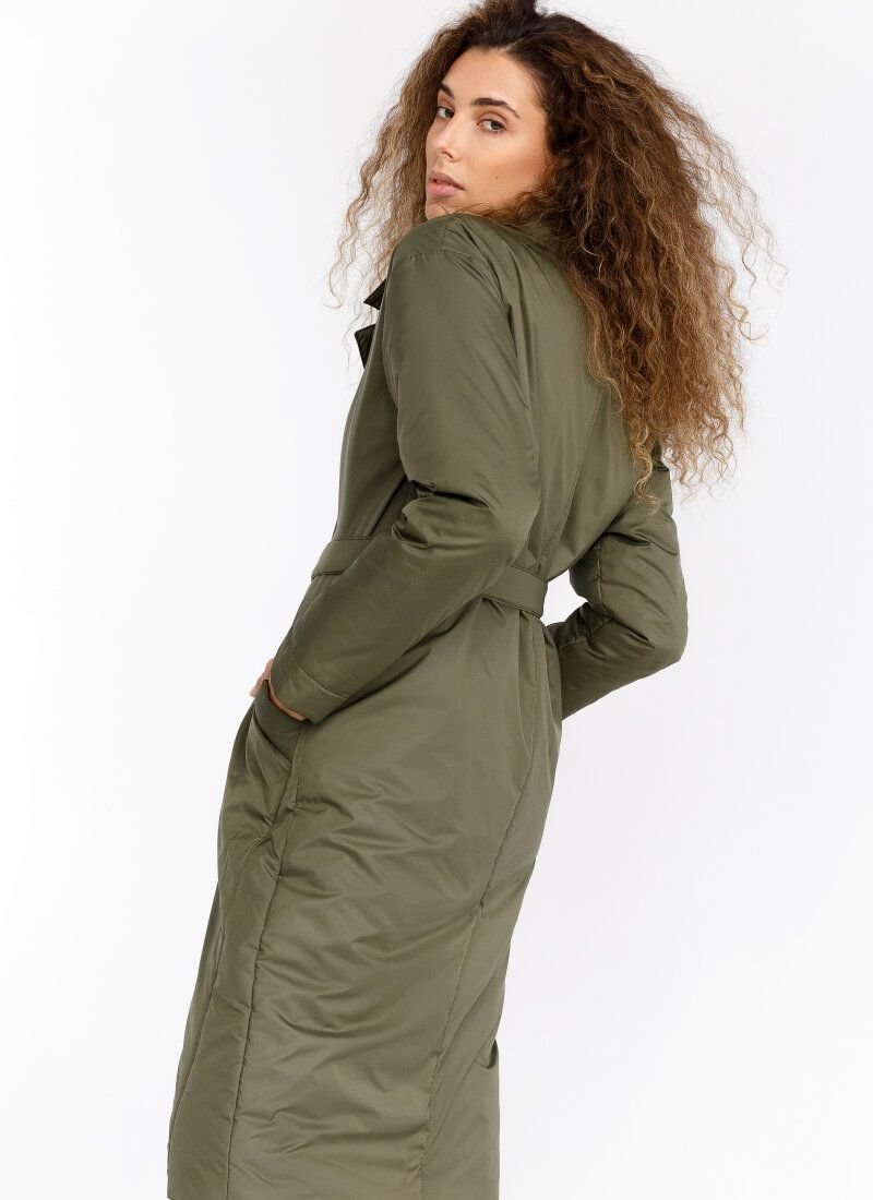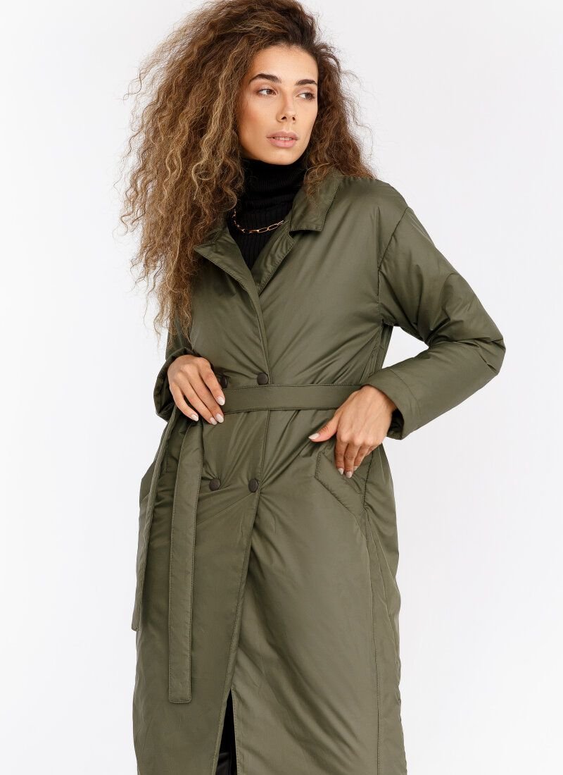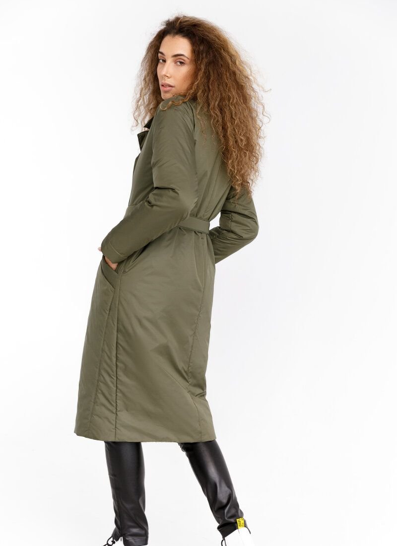 The jacket is made in the style of a feminine khaki trench coat. The model combines a classic cut and practicality. Turn-down collar, diagonal welt pockets and double-breasted button closure. A removable belt made of the main material will make the silhouette fit.Features: silicone acts as a heater (100 g/m2). Please note that the product is designed for temperatures up to +5 ° C.