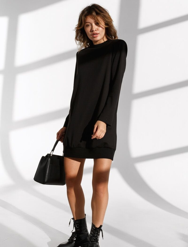 Working on a loose dress, Gepur designers relied on the contrast of colors. The basic black color of the product was contrasted with white, in which a removable turn-down collar is made. If desired, the contrasting detail can be removed, leaving the model as concise as possible. The shoulder line was emphasized with foam inserts.