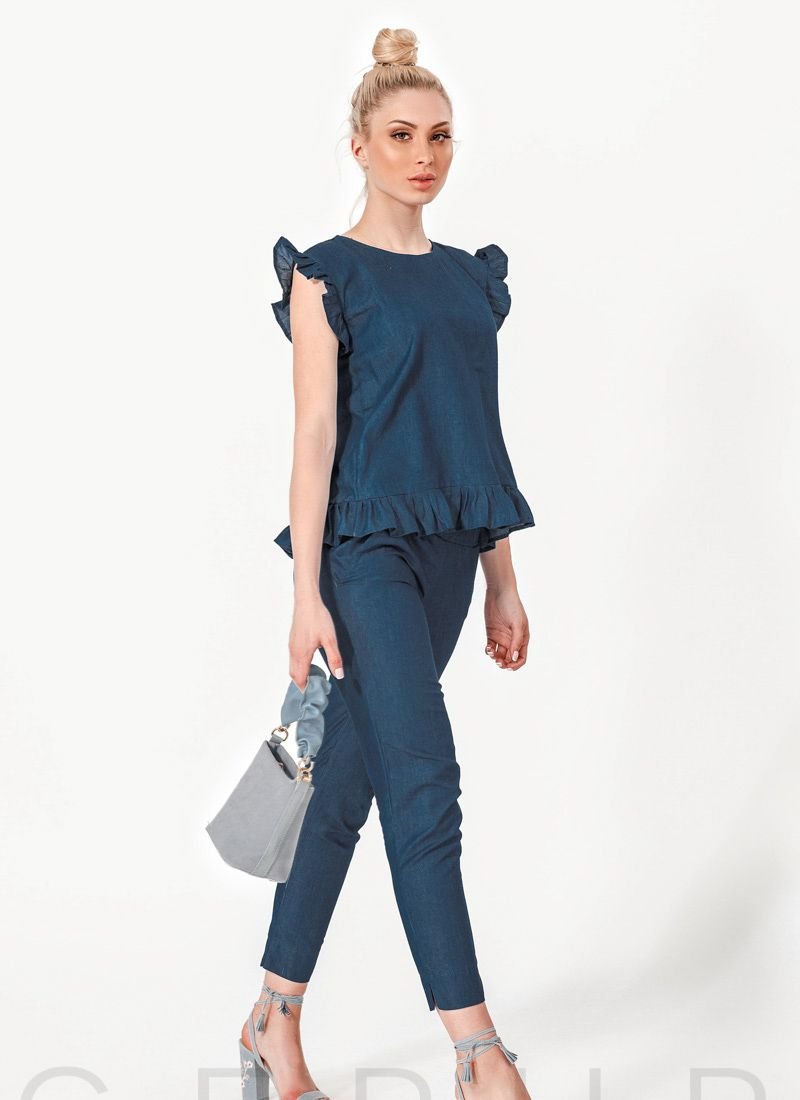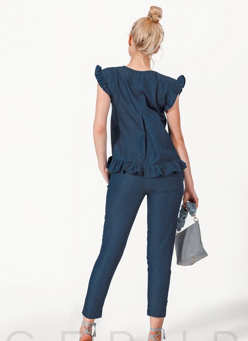 Casual denim set: a loose-fitting blouse with a classic round neck, wing sleeves and hem decorated with ruffle, narrowed trousers with a high fit on an elastic waistband and two welt pockets. .