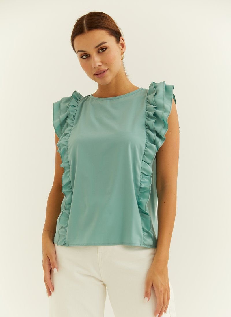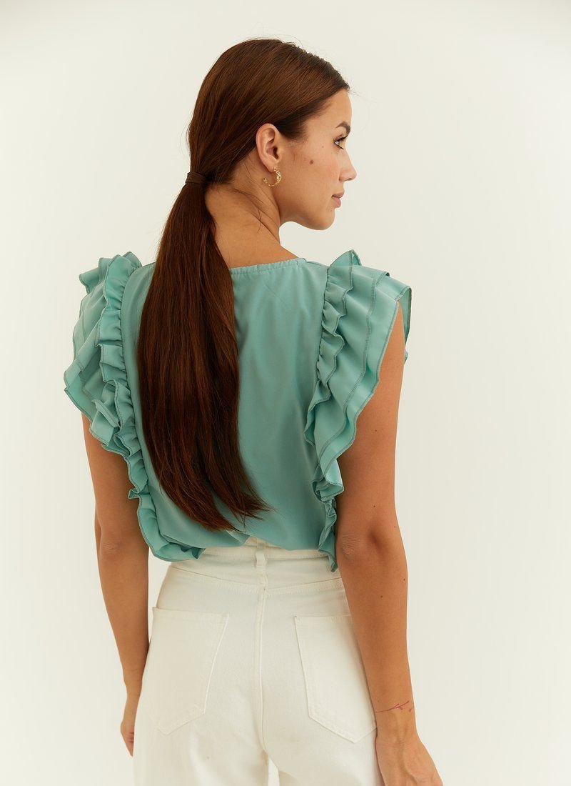 A light sleeveless blouse decorated with ruffles and ruffles. The model is made of light flowing fabric.