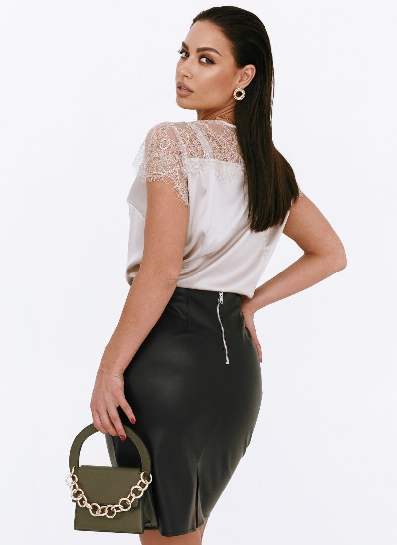 Beige silk blouse: round neck, button-down neckline at the back, yoke and sleeves are made of refined French lace with floral motifs.