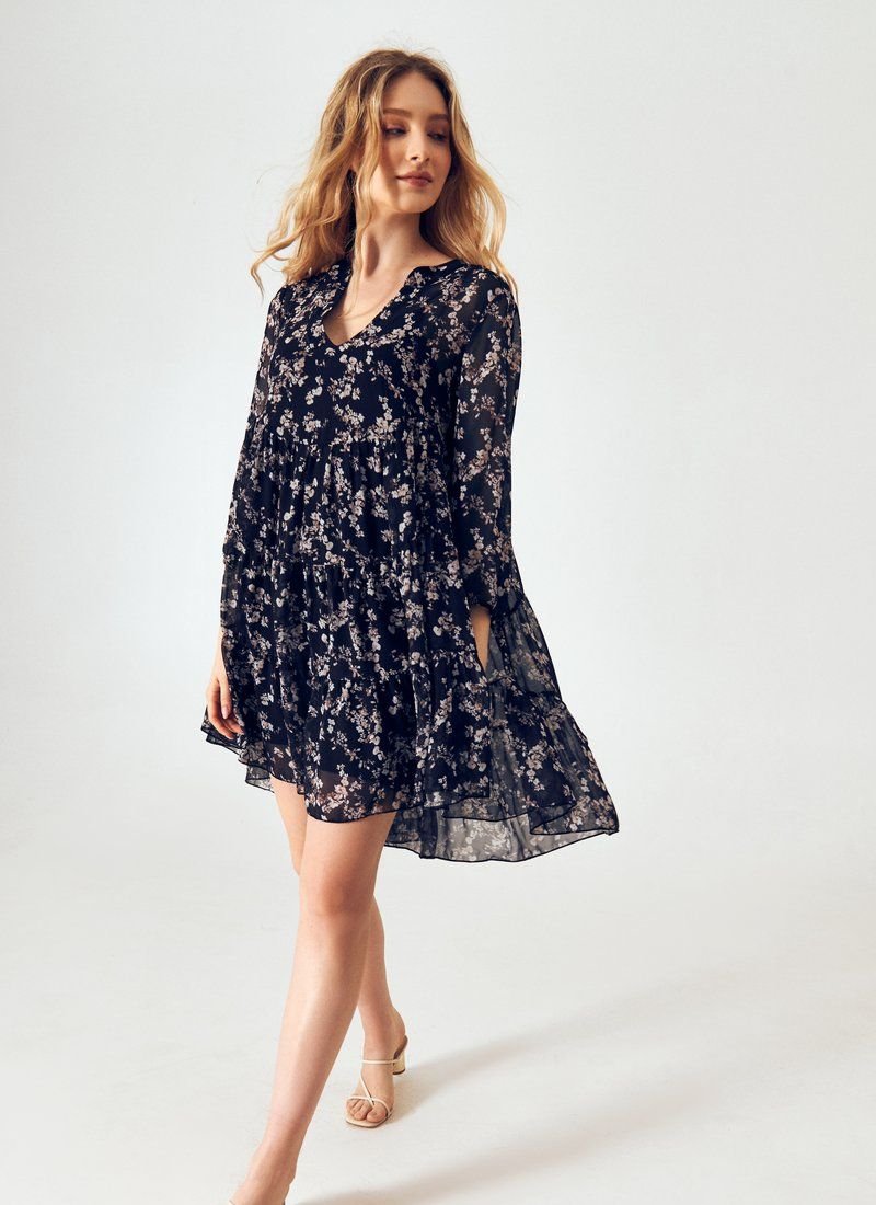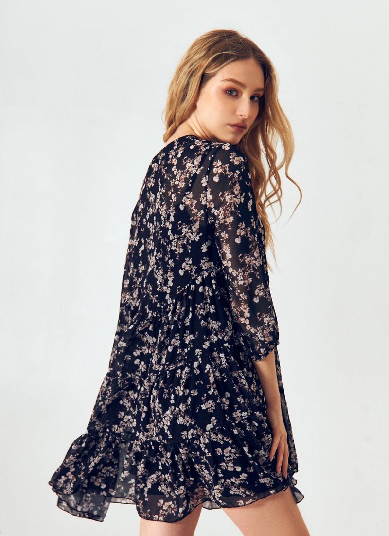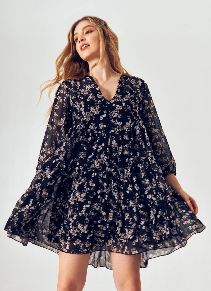 Designers do not cease to confess their love for floral motives. Models with floral prints in the SS'21 season could be seen at Valentino, Balenciaga and Celine. A mini dress made of airy chiffon was complemented with a satin lining in a linen style. A watercolor floral pattern and a flounce on the hem act as a decor. The decollete area was emphasized by a v-neck.