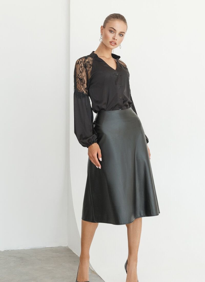 A black blouse shirt made of flowing silk will become a more feminine alternative to a basic shirt. The blouse is complemented by puffy sleeves on elastic cuffs. Inserts of openwork lace on the shoulders act as a decor.