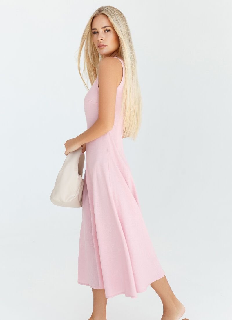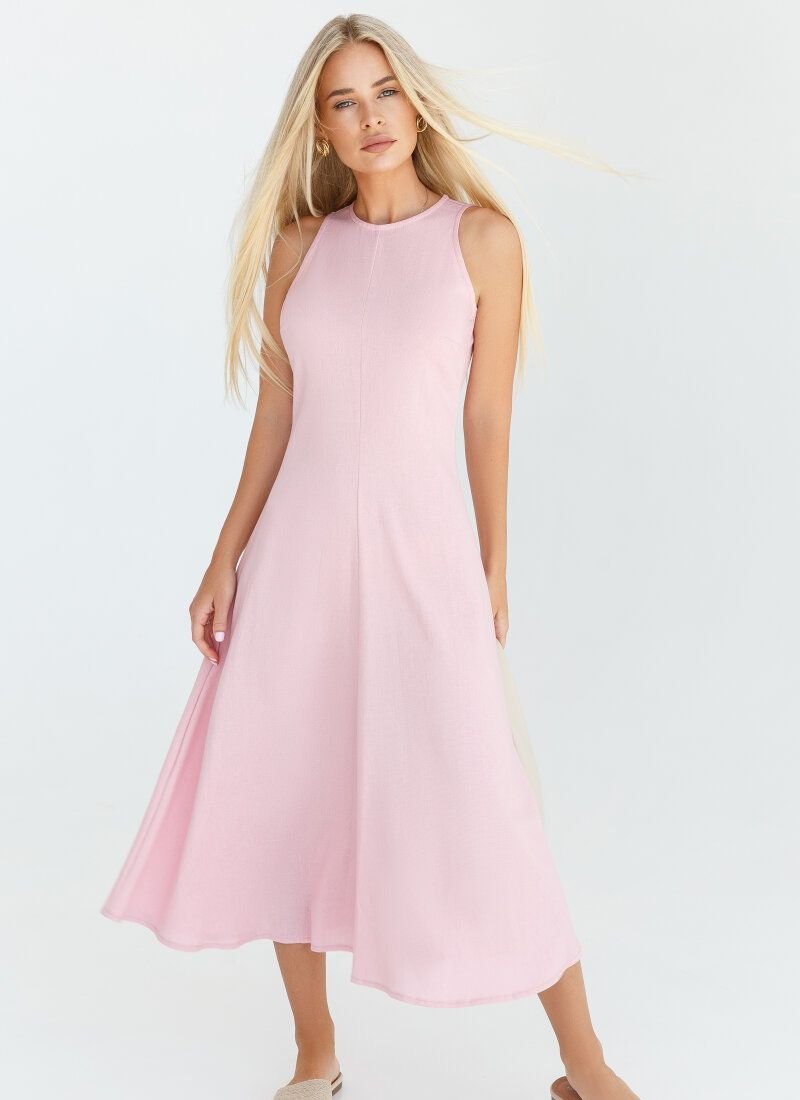 A laconic cut dress made of pink linen fabric. Round collar, fitted cut.