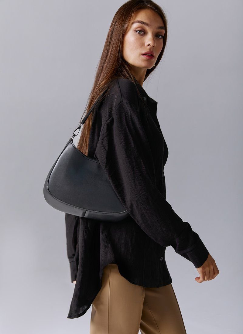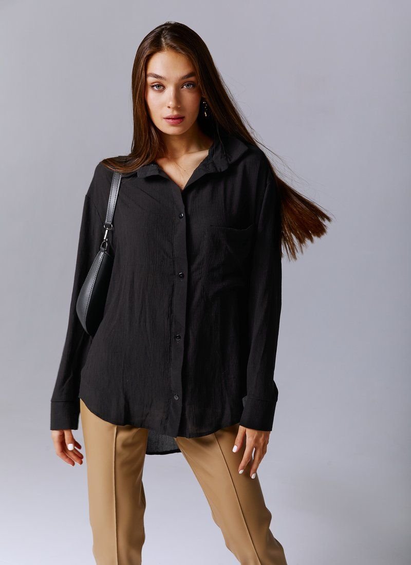 The classic black shirt is made of a chiffon header material. The model is cut oversize, long sleeves at the cuffs, buttons in front, turn-down collar. The shirt can be worn both with trousers and jeans, as a separate element, or in combination with tops or jumpers.