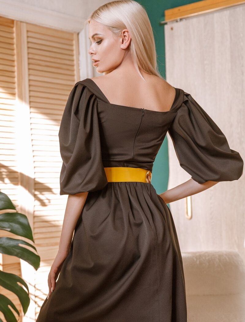 A flirty mini dress with a straight cut of a basic black color. Shallow neckline, voluminous cropped sleeve. Cut-off high waist, complemented by a contrasting wide belt. Flared skirt in a light pleat with pockets in the seams.