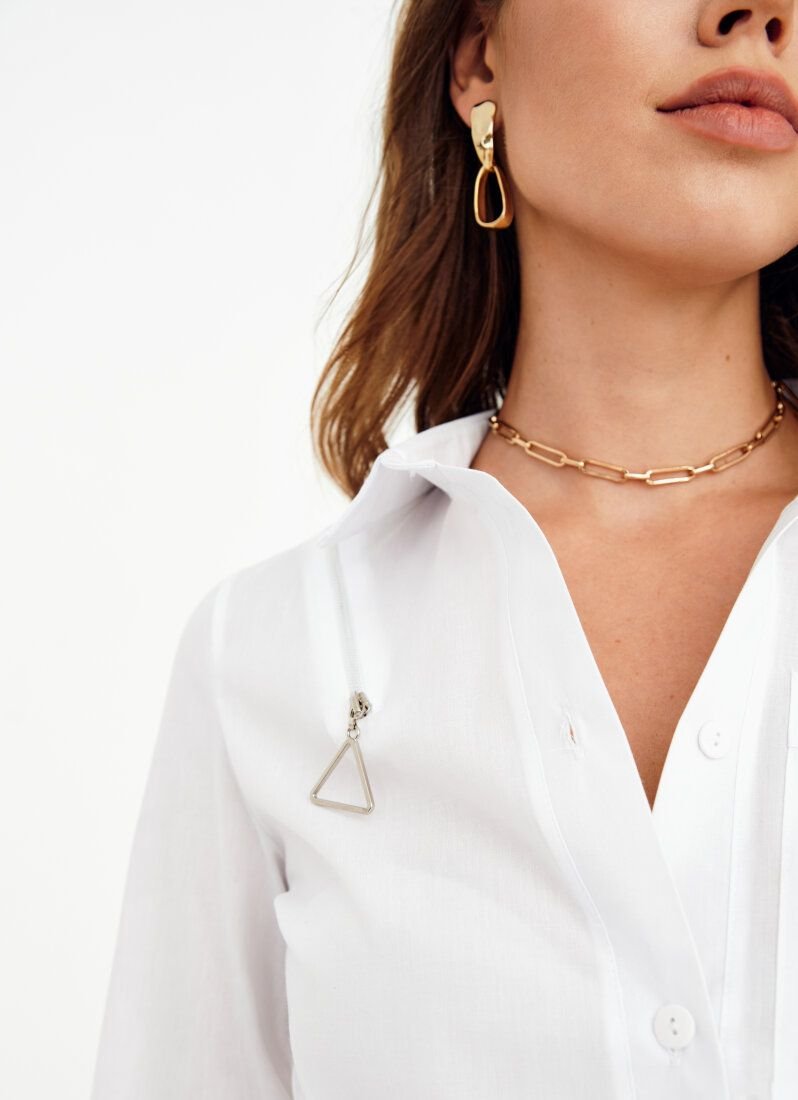 Cotton with cotton was used to create a white shirt, so the model turned out to be pleasant to the body. The product of a classic cut with a turn-down collar was decorated with decorative zippers.