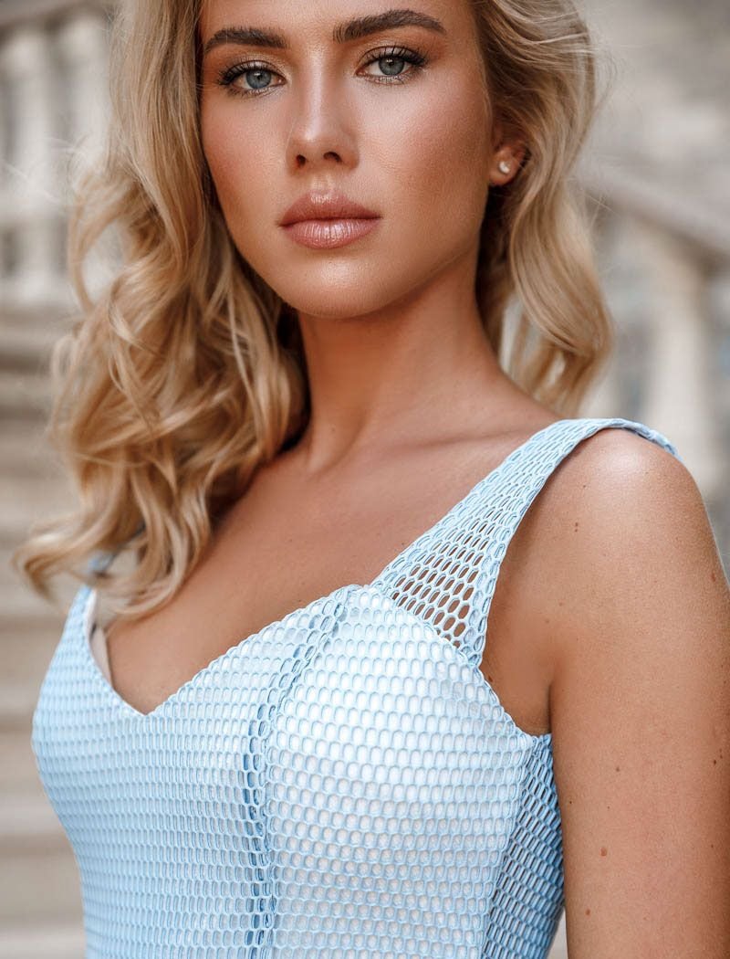 The dress of the original design created by Gepur designers: a curly neckline, wide non-adjustable straps, a cut-off high waist and a half-sun skirt.
